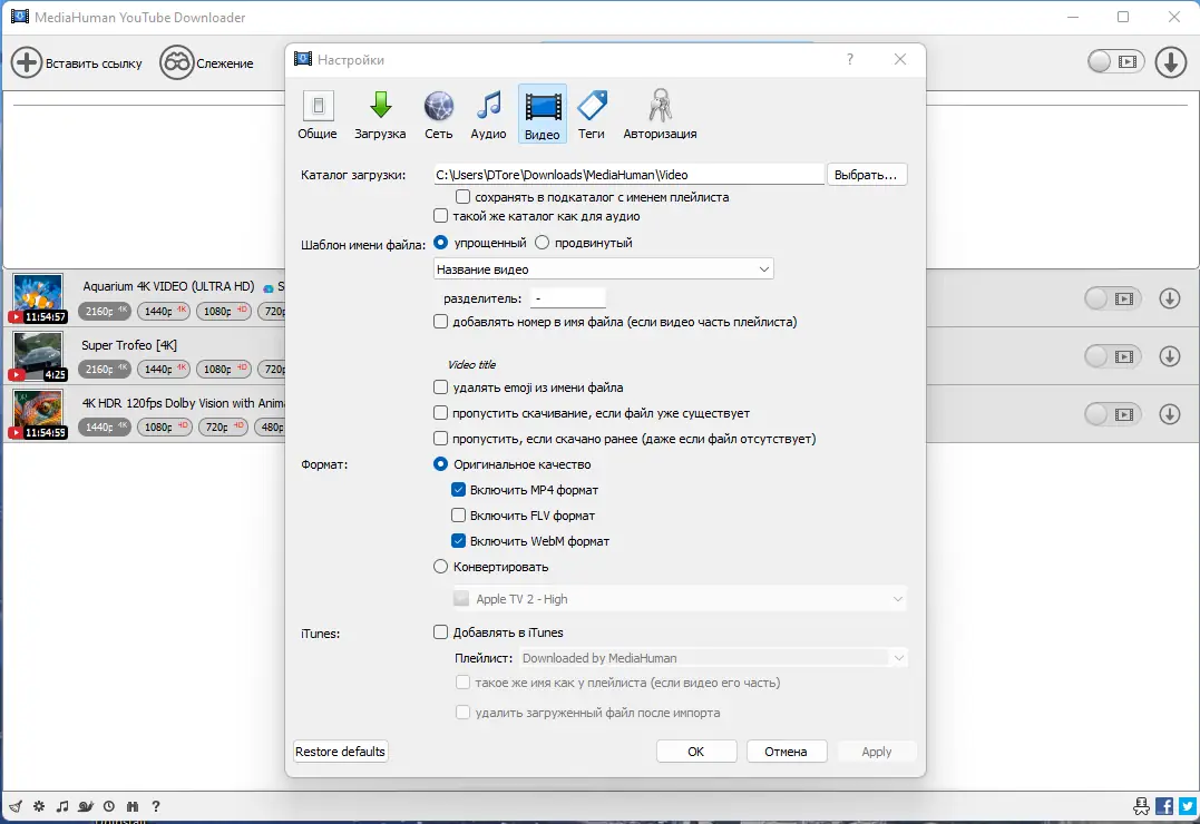 - Автоматическое добавление скачанных роликов в iTunes/Music.app и указание конкретных плейлистов