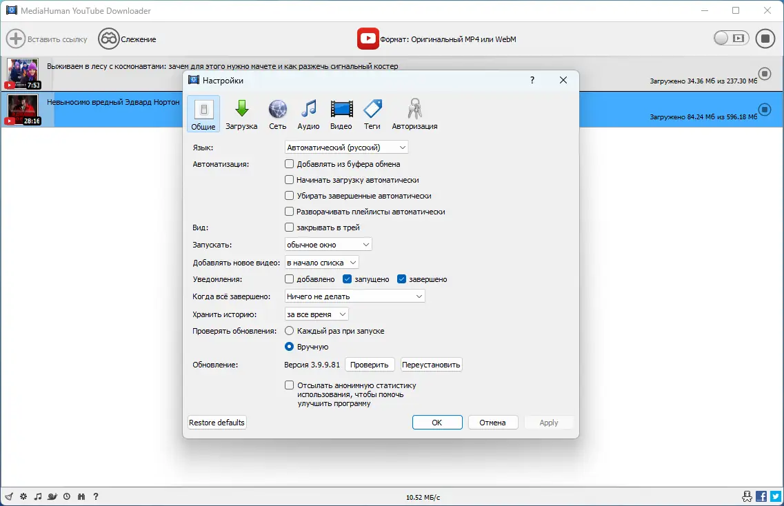 - По завершении установки, можно настроить автоматическую загрузку по буферу обмена или подключить учетные записи YouTube, чтобы получать доступ к закрытым или ограниченным по возрасту видео.