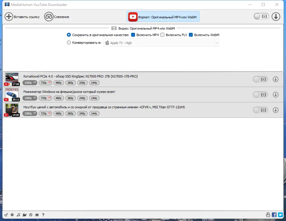 - Закачка нескольких файлов одновременно, включая целые плейлисты и каналы