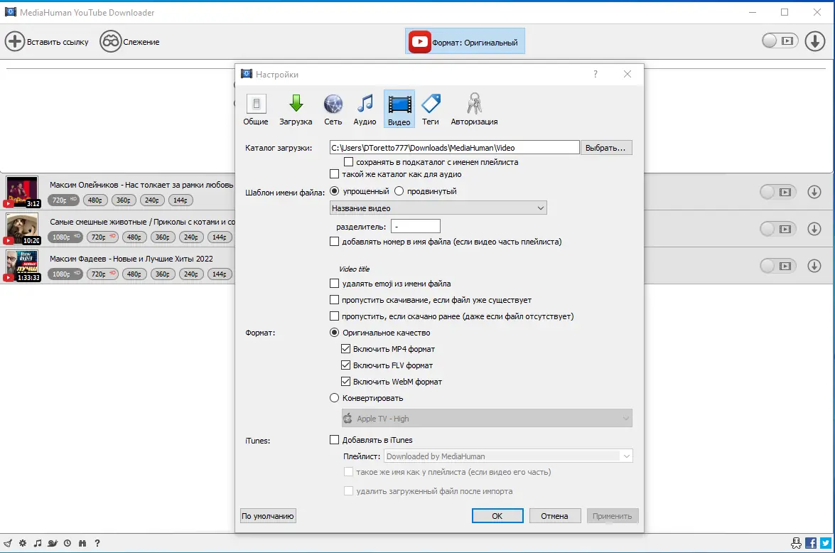 - Поддержка автоматического добавления скачанных видео в iTunes/Music.app с указанием плейлиста;