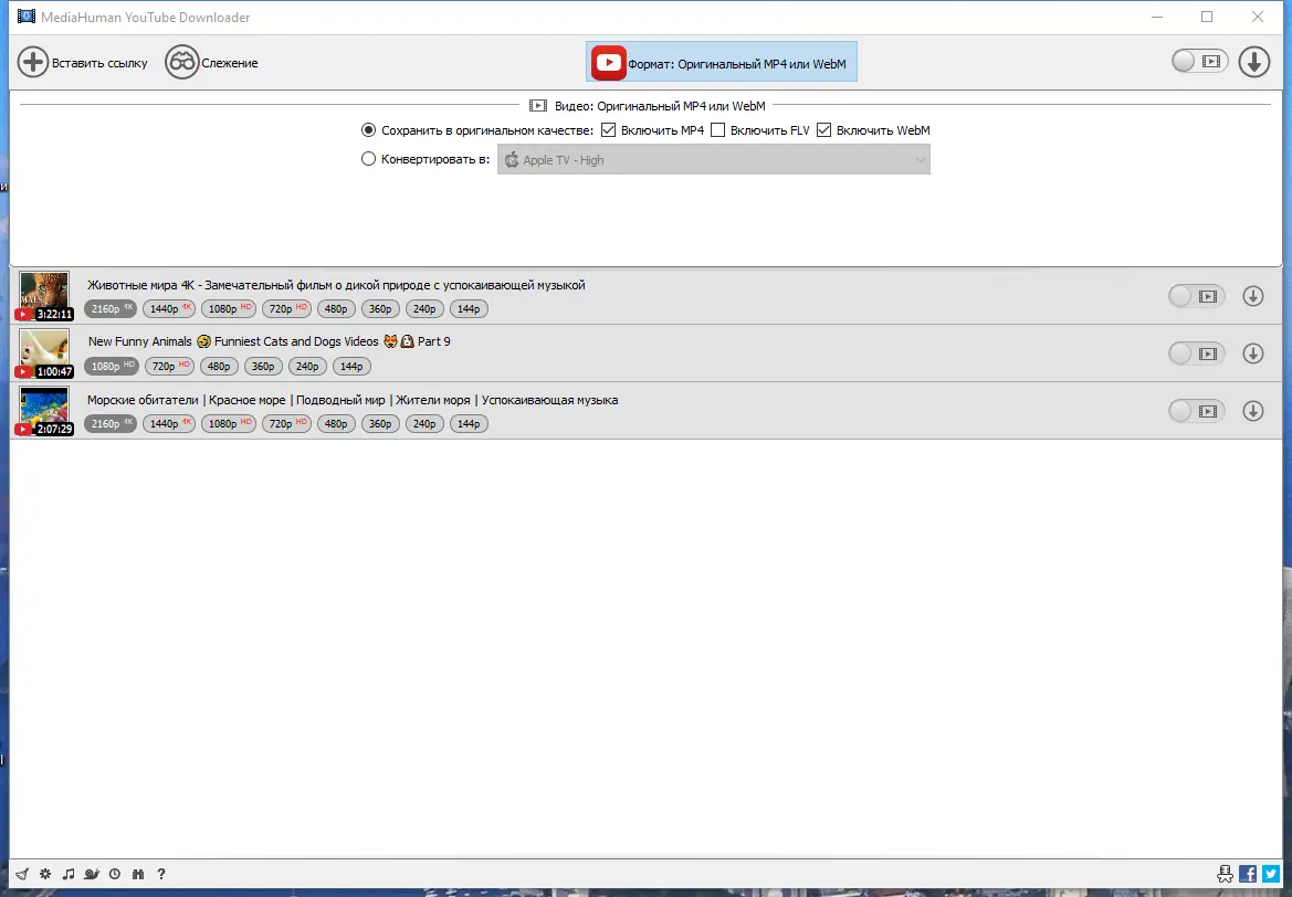 MediaHuman YouTube Downloader — это универсальный инструмент для загрузки медиафайлов с различных платформ с простым интерфейсом и множеством функций. Он подходит как для пользователей, желающих скачивать отдельные видео, так и для тех, кто предпочитает автоматизацию и массовую загрузку.