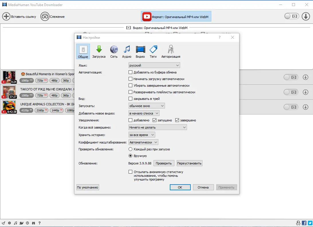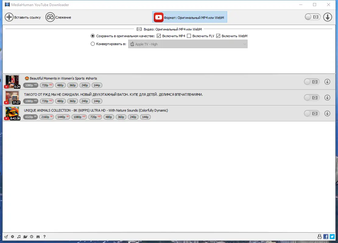 - Загрузка в оригинальном разрешении: 720p, 1080p, 4K, 8K и др., с выбором качества.