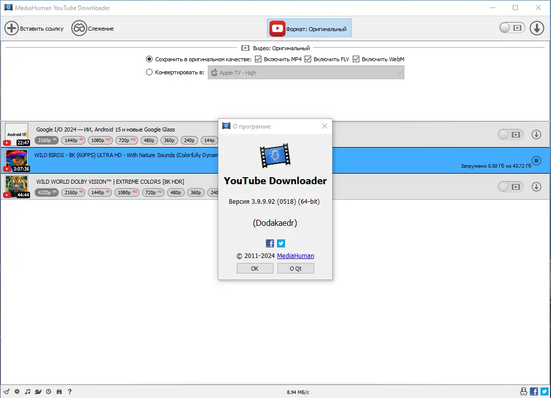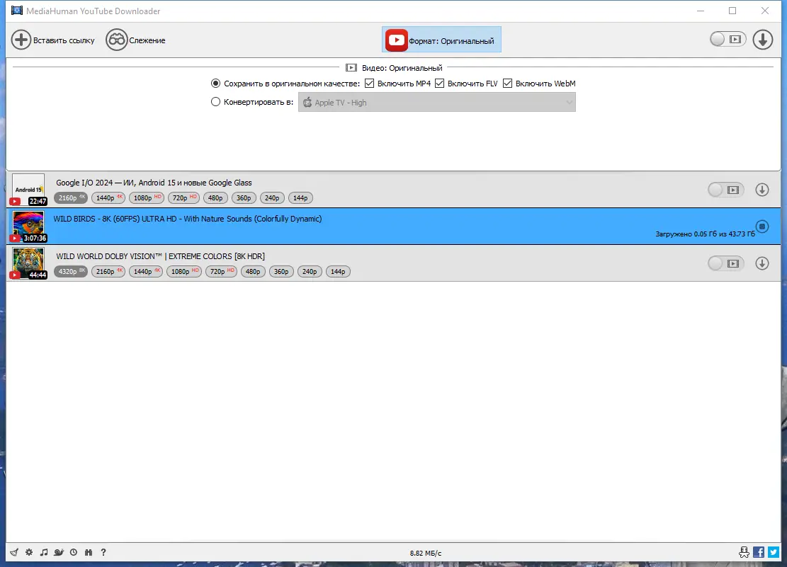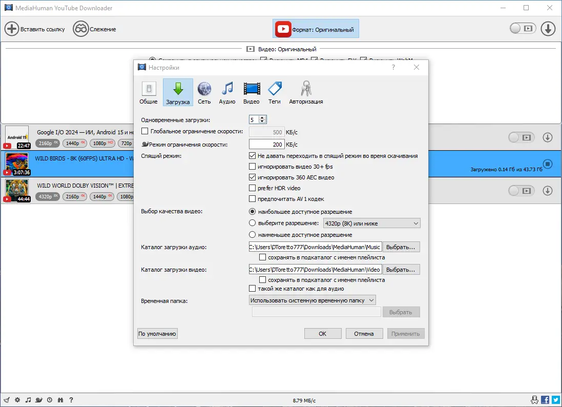 - Загружает видео в разрешениях HQ, HD, 4K или 8K с возможностью выбора качества