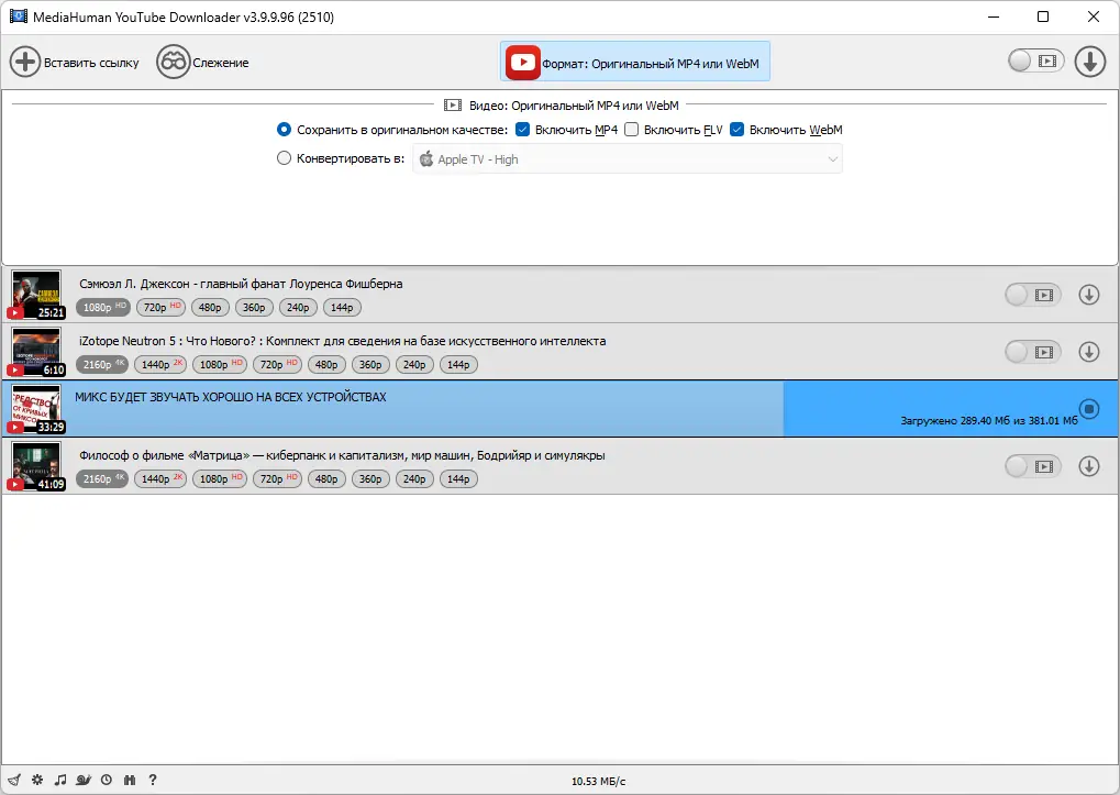 - Множественная загрузка файлов одновременно, включая целые плейлисты и каналы.