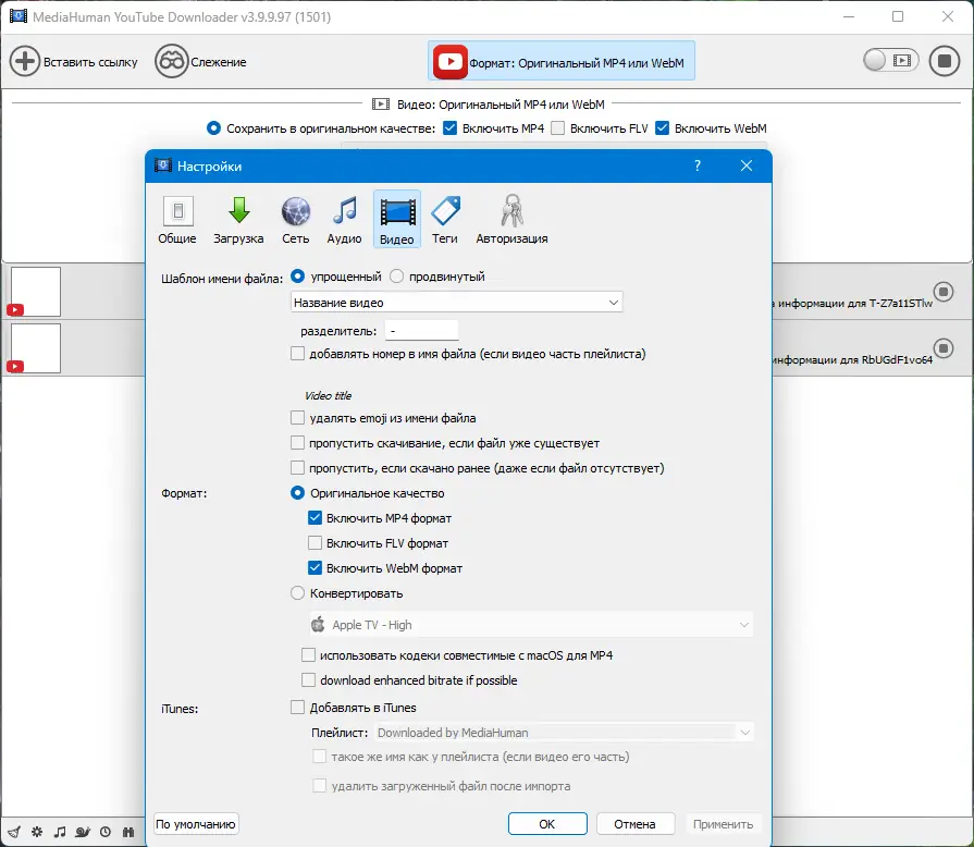 - Интеграция с iTunes и Music.app для автоматического добавления скачанных файлов в музыкальные библиотеки