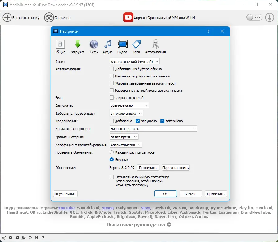 Обратите внимание, что в России с августа 2024 года возможны ограничения в работе YouTube. В таком случае рекомендуется использовать VPN или другие способы обхода блокировок для успешной работы программы.