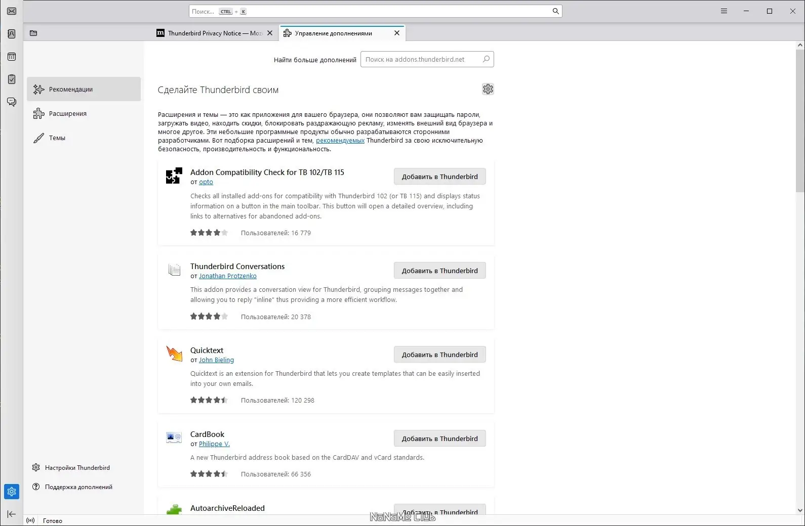 Программа отличается высокой безопасностью, включает защиту от мошеннических писем, блокировку внешних изображений по умолчанию и автоматические обновления для обеспечения актуальности и защиты данных. Современный дизайн и возможность изменения внешнего вида с помощью тем делают работу с программой более приятной. Кроме того, Thunderbird активно развивается за счет открытых исходных кодов, что способствует быстрому исправлению уязвимостей и интеграции новых технологий.