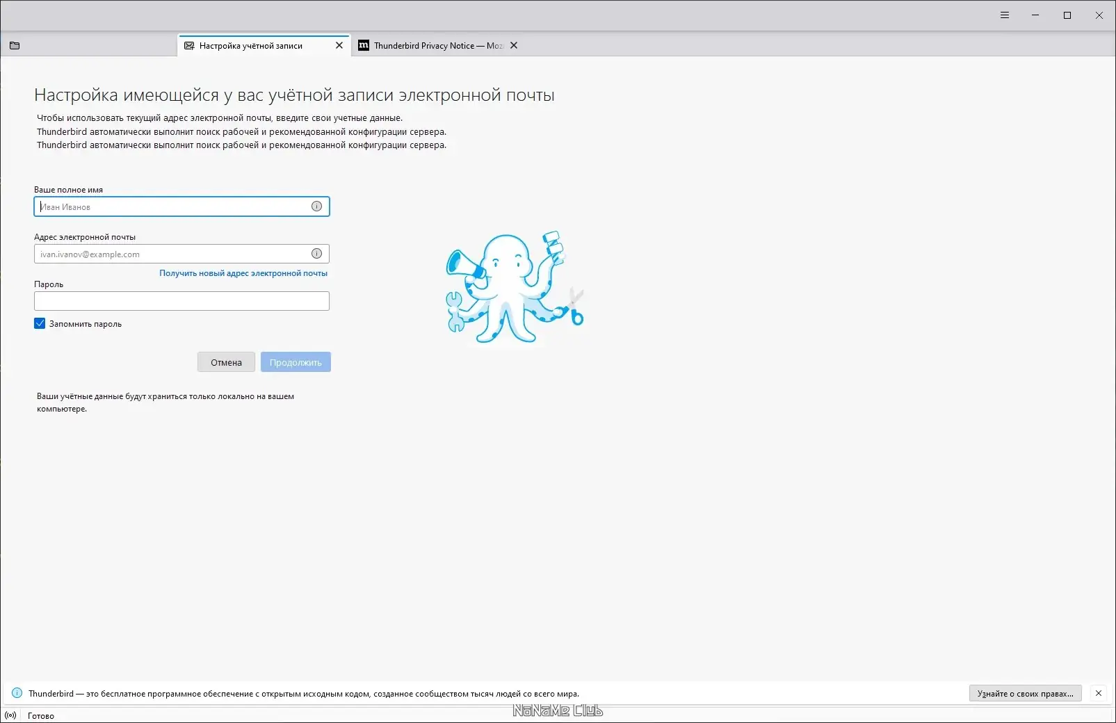 - По завершении установки запустите программу и настройте учетную запись, предоставляя только имя, адрес и пароль.