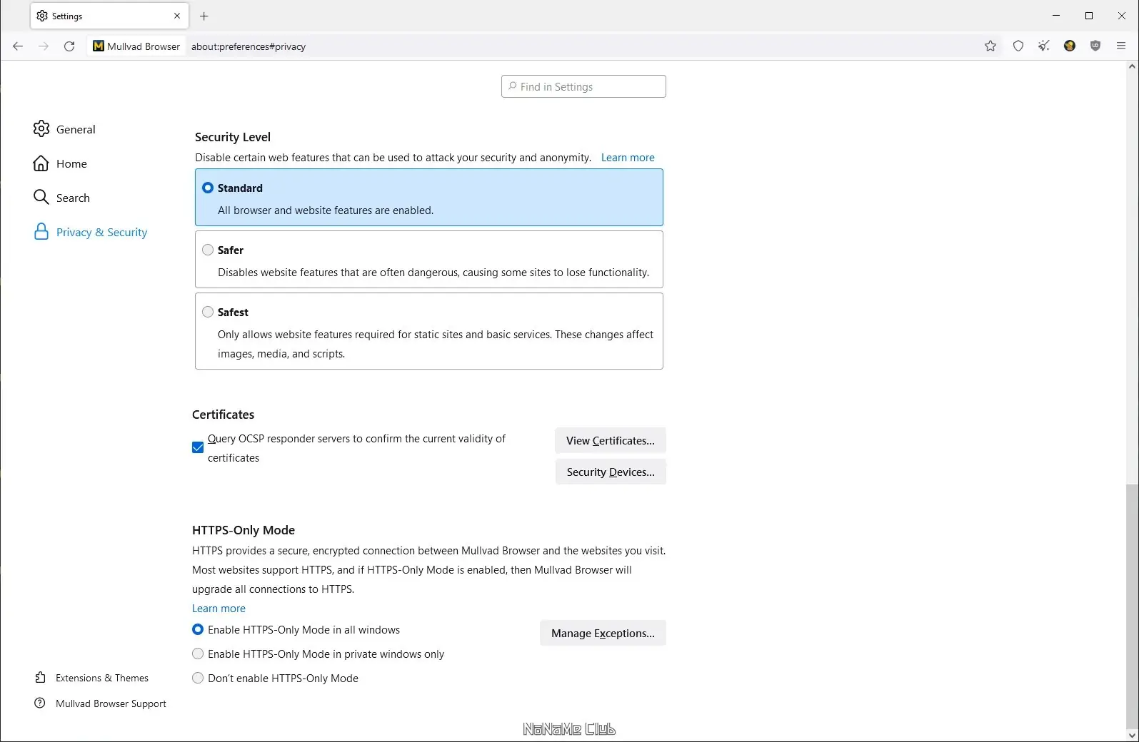 - Поддержка режима «HTTPS Only» для шифрования трафика на всех совместимых сайтах.