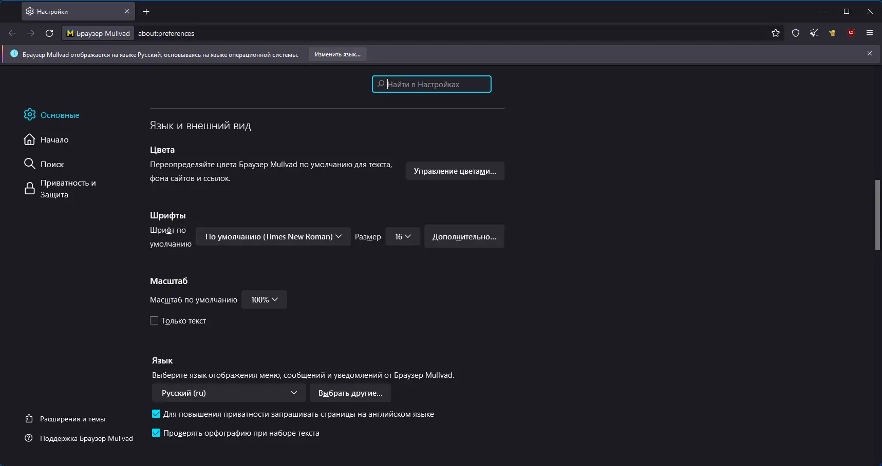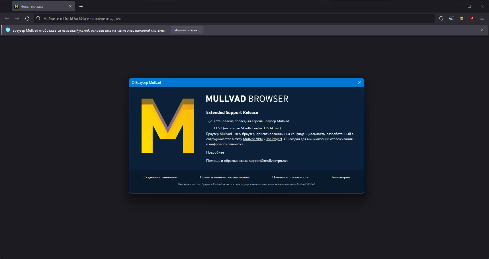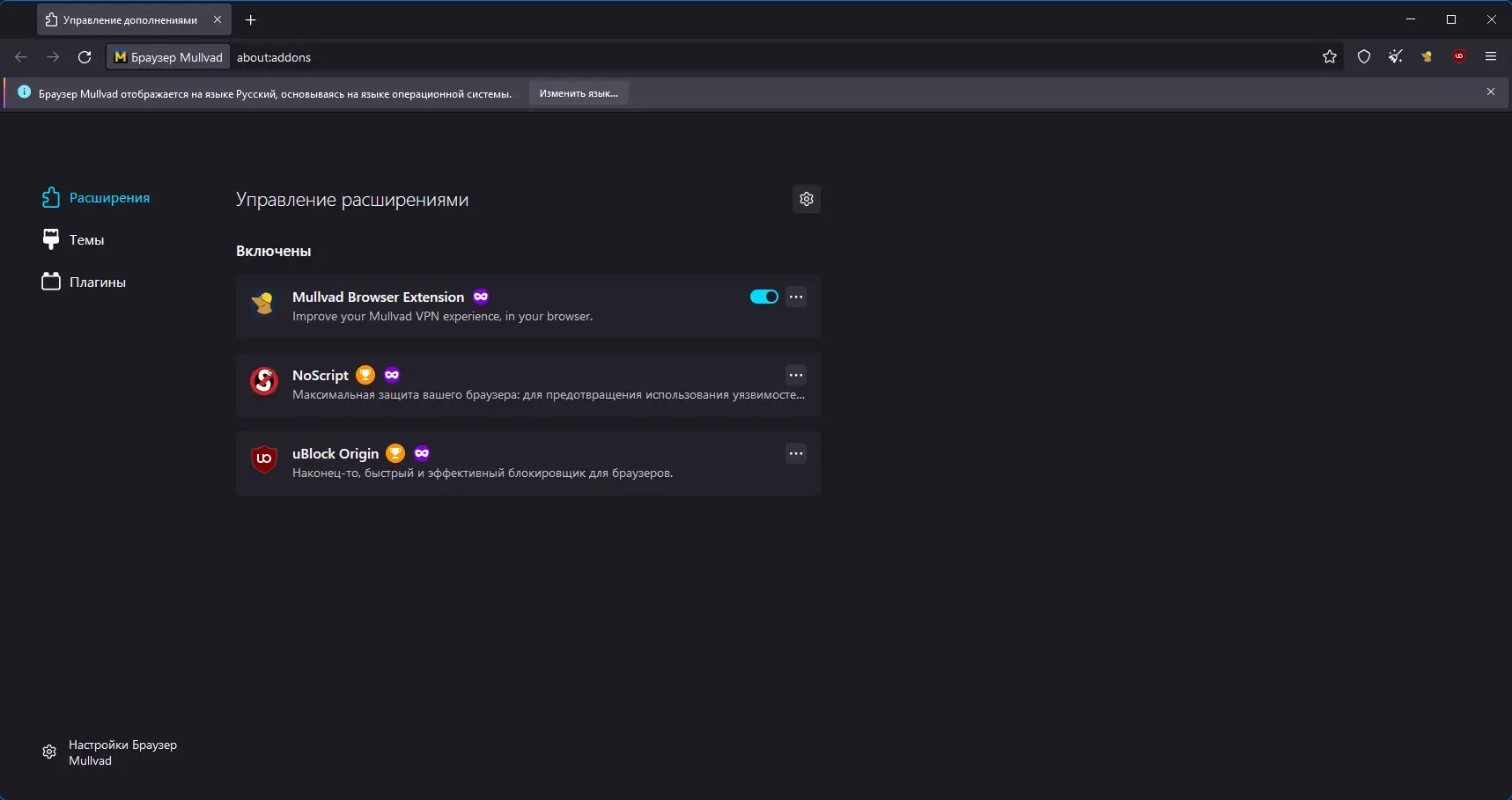 - Интегрированное дополнение Mullvad для отображения информации о IP и подключениях.