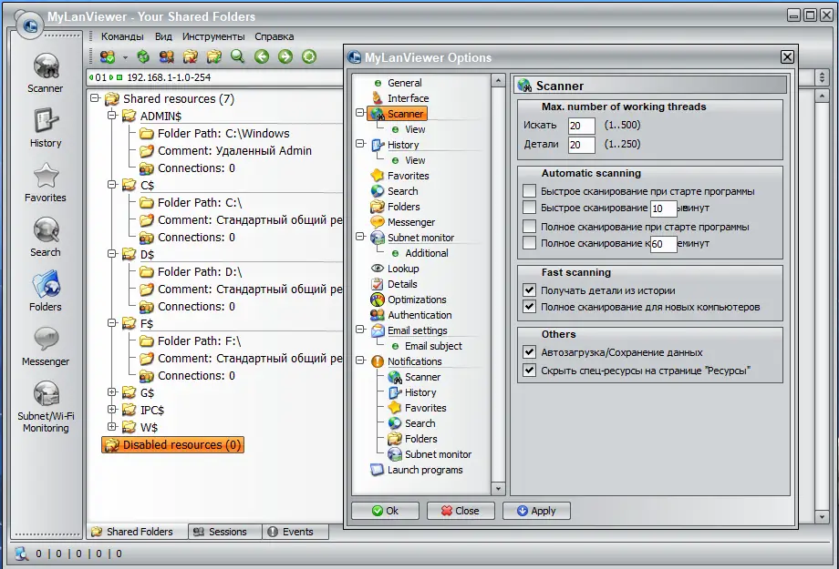 MyLanViewer — это мощная утилита для сканирования и мониторинга компьютеров в локальной сети с возможностью поиска общедоступных файлов и ресурсов. Она предоставляет компактный и удобный интерфейс, показывающий информацию о каждом устройстве, такие как имя компьютера, IP и MAC адреса, а также список общих ресурсов. Программа позволяет отслеживать состояние сетевых устройств в реальном времени, получать автоматические оповещения при их изменениях и управлять доступом к общим файлам, блокируя или закрывая сессии по необходимости.