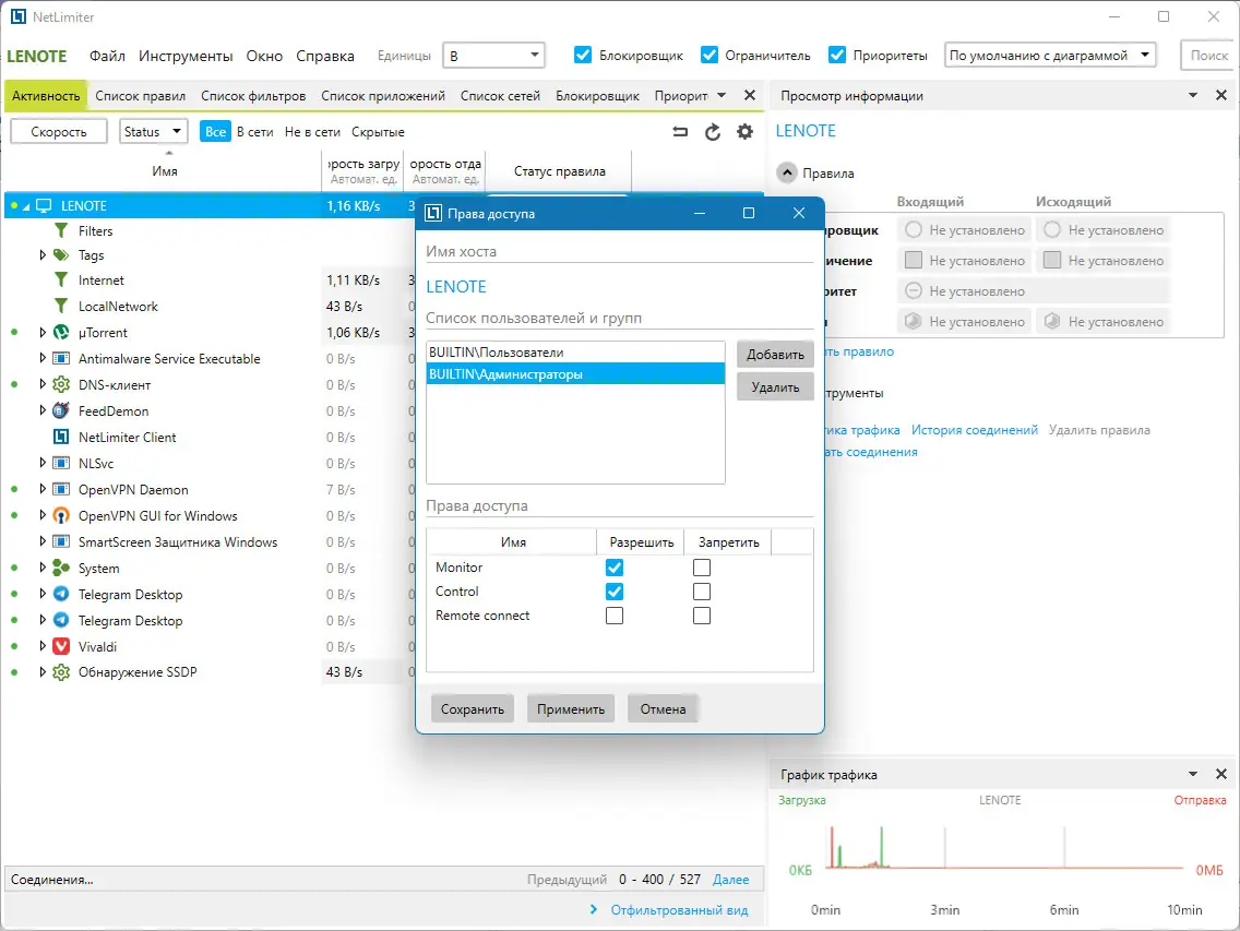 - Мониторинг трафика приложений и подключений в реальном времени