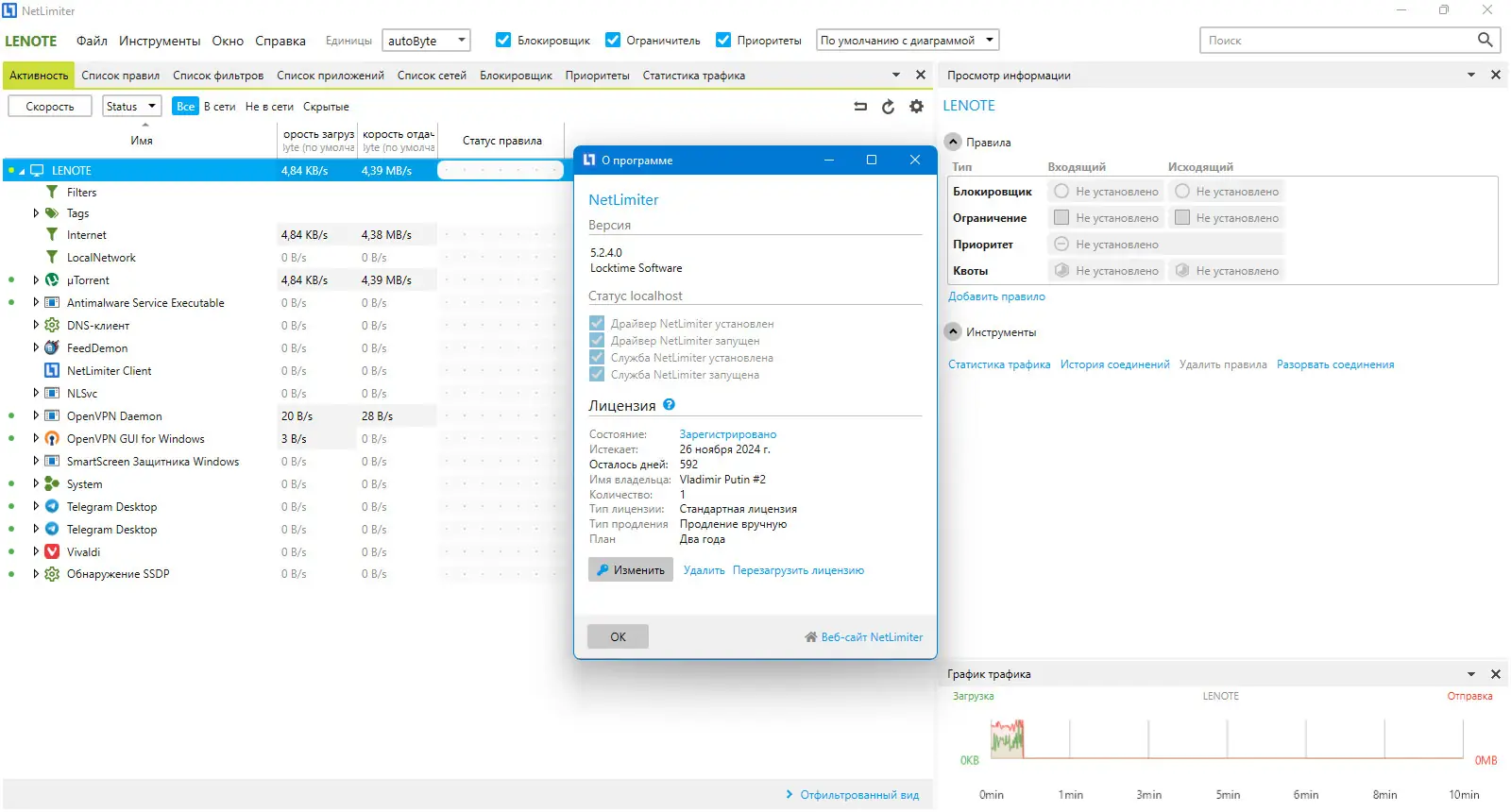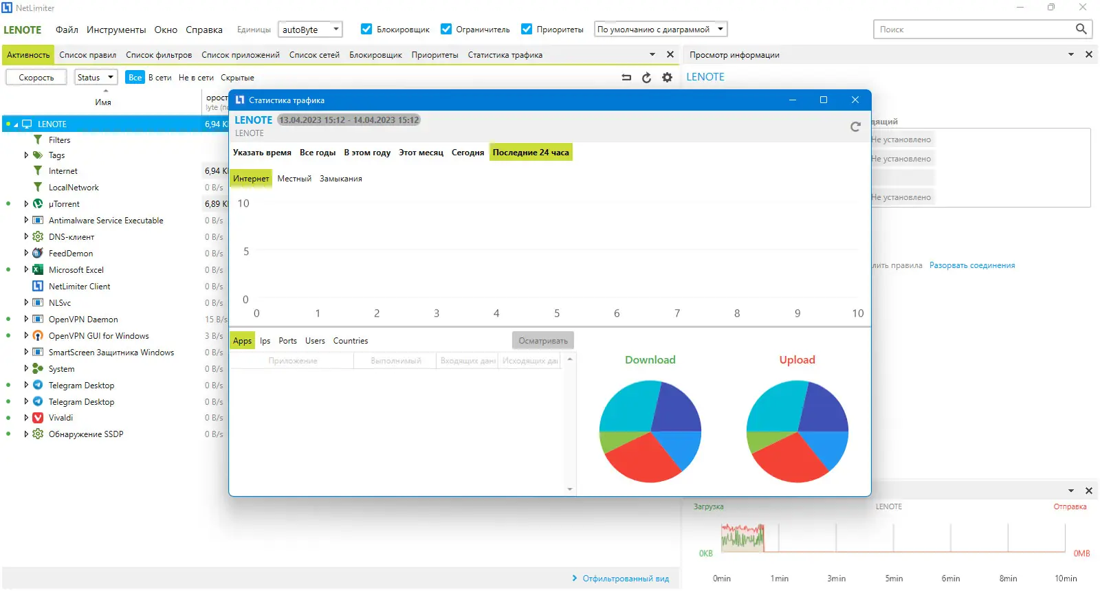 NetLimiter — это мощное решение для контроля и управления сетевым трафиком на компьютере. Программа отслеживает деятельность каждого приложения, использующего доступ к Интернету, и позволяет активно управлять потоком данных, устанавливая ограничения на скорость загрузки и отдачи. Благодаря этому можно эффективно регулировать использование сетевых ресурсов, предотвращая излишнюю нагрузку со стороны отдельных программ. Помимо этого, NetLimiter ведет подробную статистику всех соединений, отображая данные в виде графиков и таблиц для анализа использования сети.