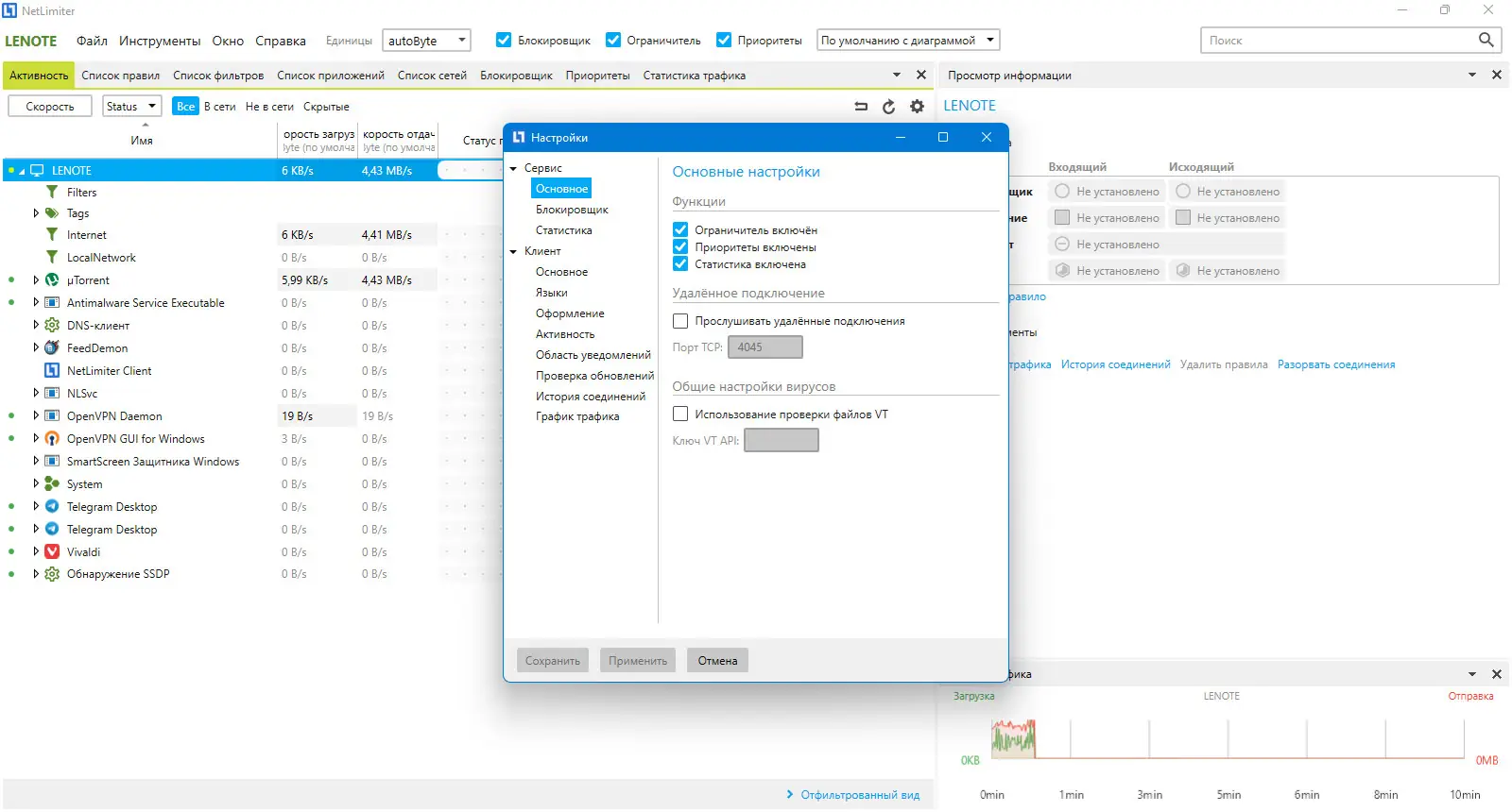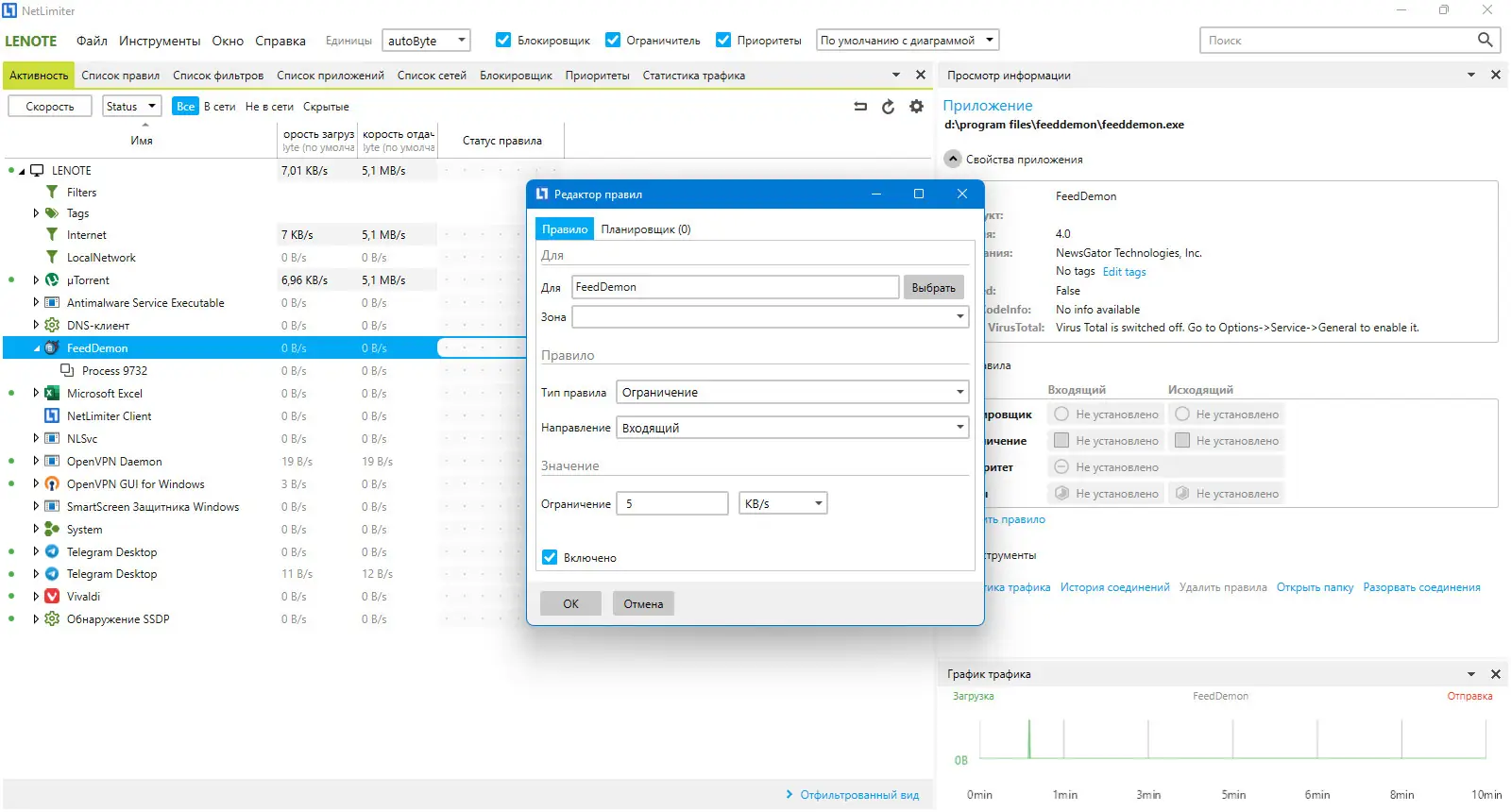 - Настройка ограничений скорости для любого запускаемого приложения.