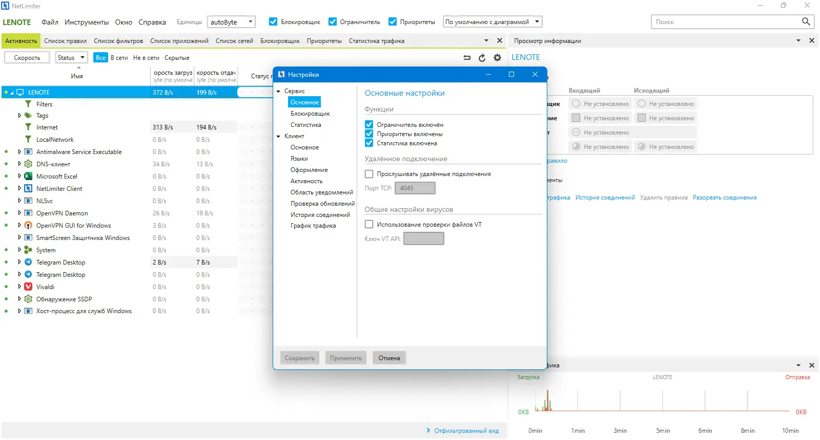- Возможность блокировки и ограничения скорости для отдельных приложений