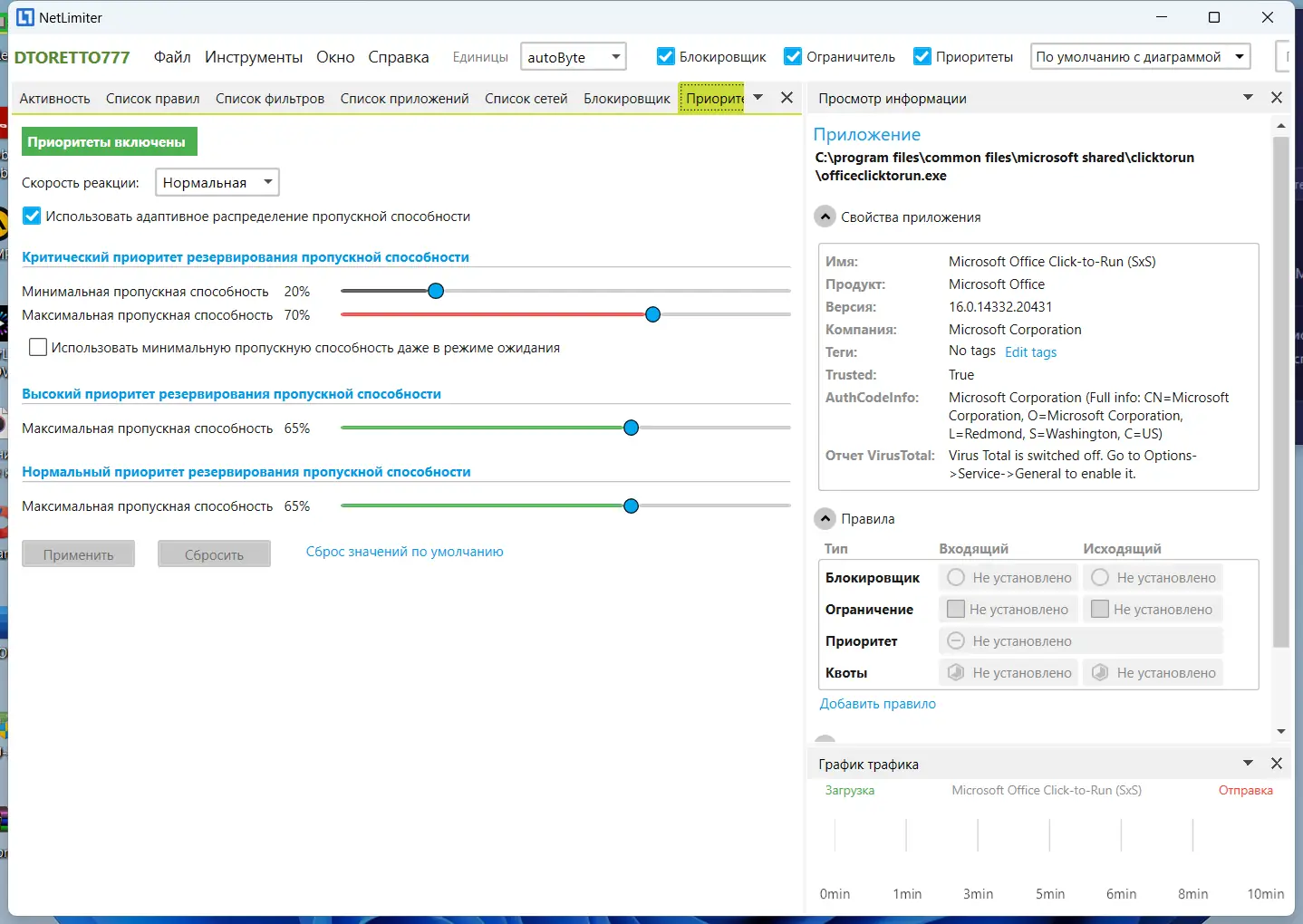 NetLimiter – это мощная программа для контроля и управления сетевым трафиком на вашем ПК. Она позволяет следить за деятельностью каждого приложения, использующего доступ к Интернету, и активно регулировать скорость передачи данных. Разработанная для пользователей, нуждающихся в точном управлении интернет-ресурсами, эта программа предоставляет инструменты для ограничения скорости, блокировки нежелательных соединений и анализа статистики в реальном времени. Благодаря быстрой настройке и детальной отчетности, она значительно повышает безопасность и эффективность работы с сетью.