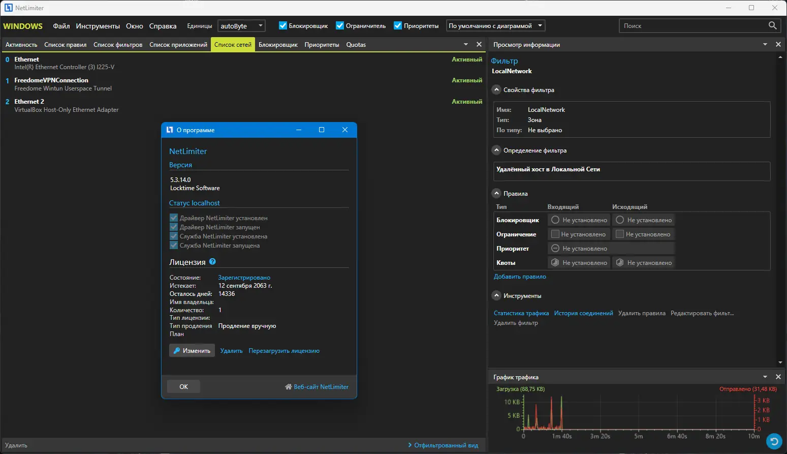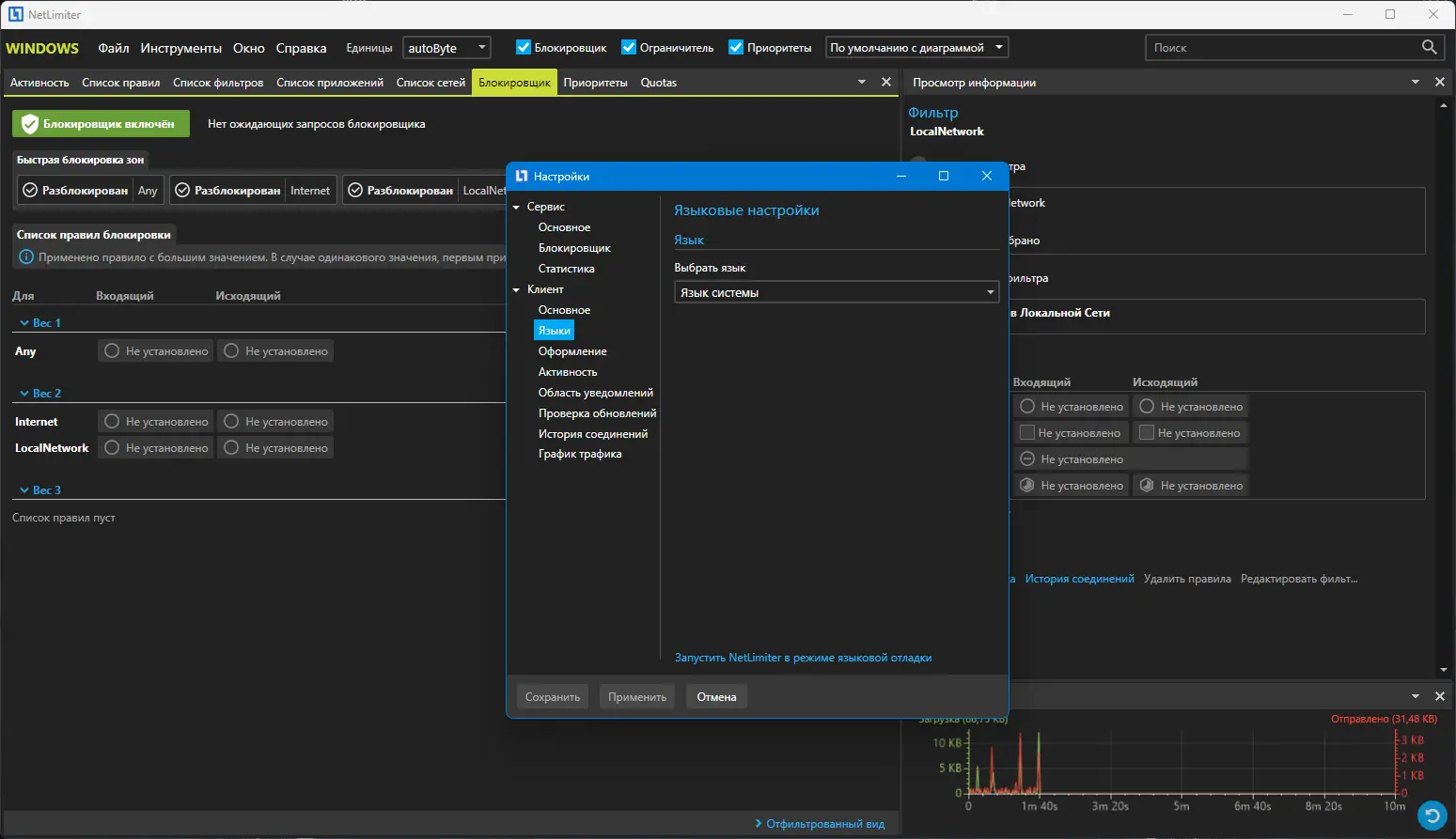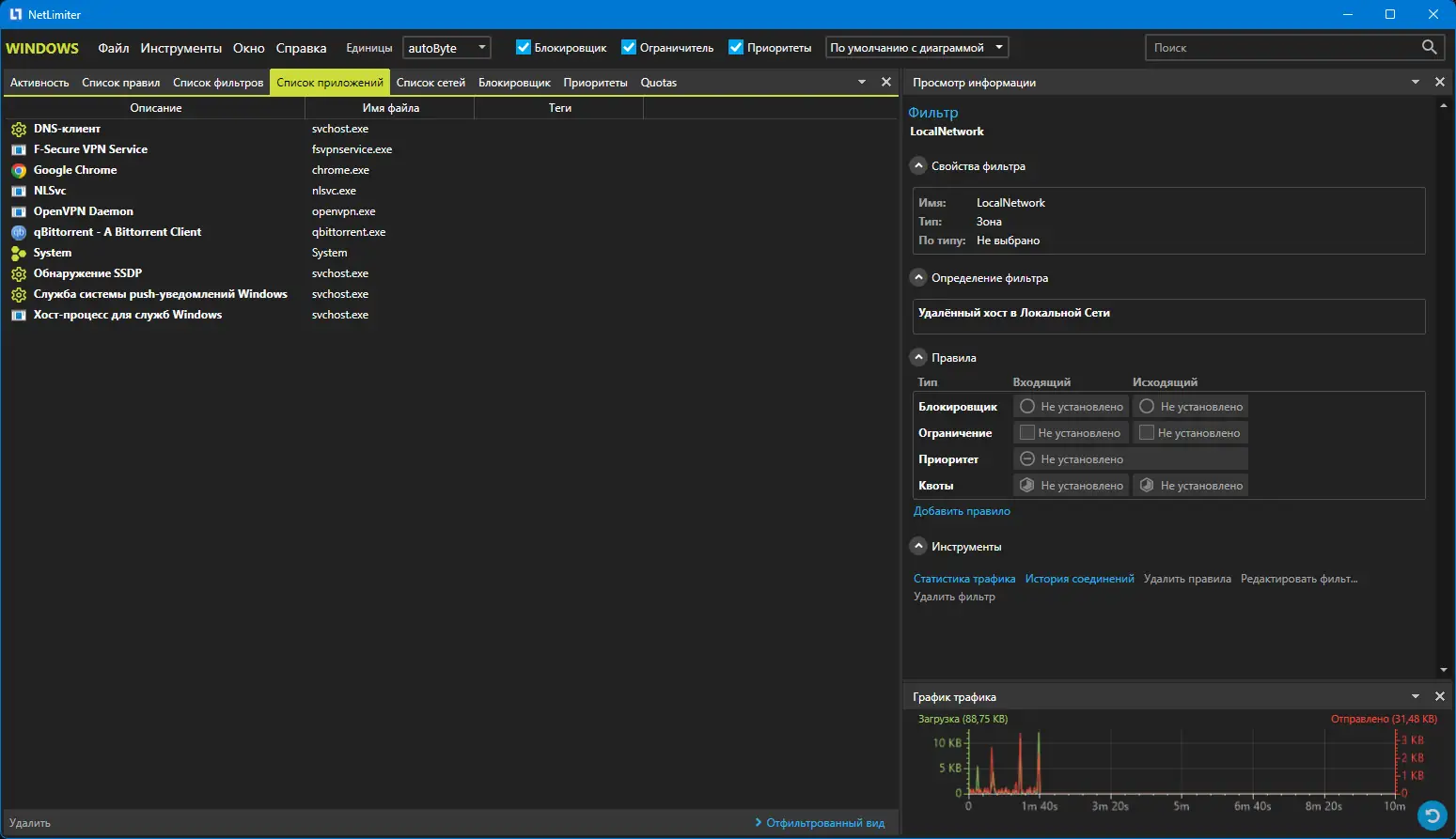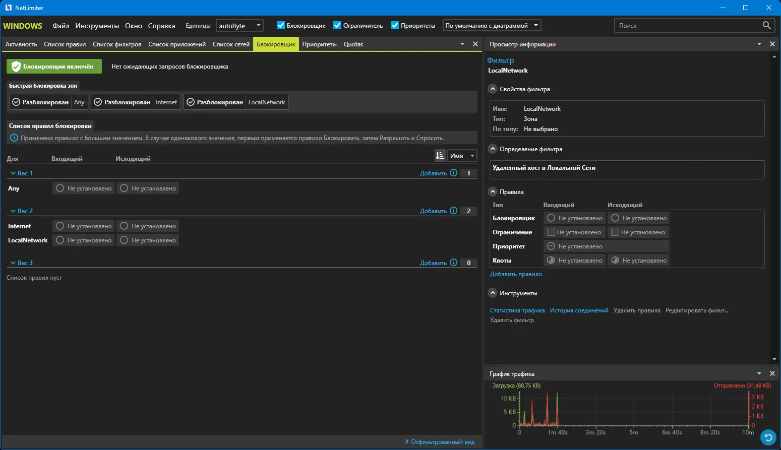 NetLimiter — это решение для мониторинга и ограничения сетевой активности, которое дает пользователю полный контроль над трафиком. Программа следит за всеми происходящими соединениями, ведет детальную статистику в виде графиков и таблиц, а также позволяет при необходимости блокировать или ограничивать доступ приложений к интернету. Основной особенностью является возможность самостоятельно настроить скорость загрузки и отдачи данных для каждого отдельного приложения или соединения, что особенно важно при работе с ограниченными каналами или для приоритезации трафика.