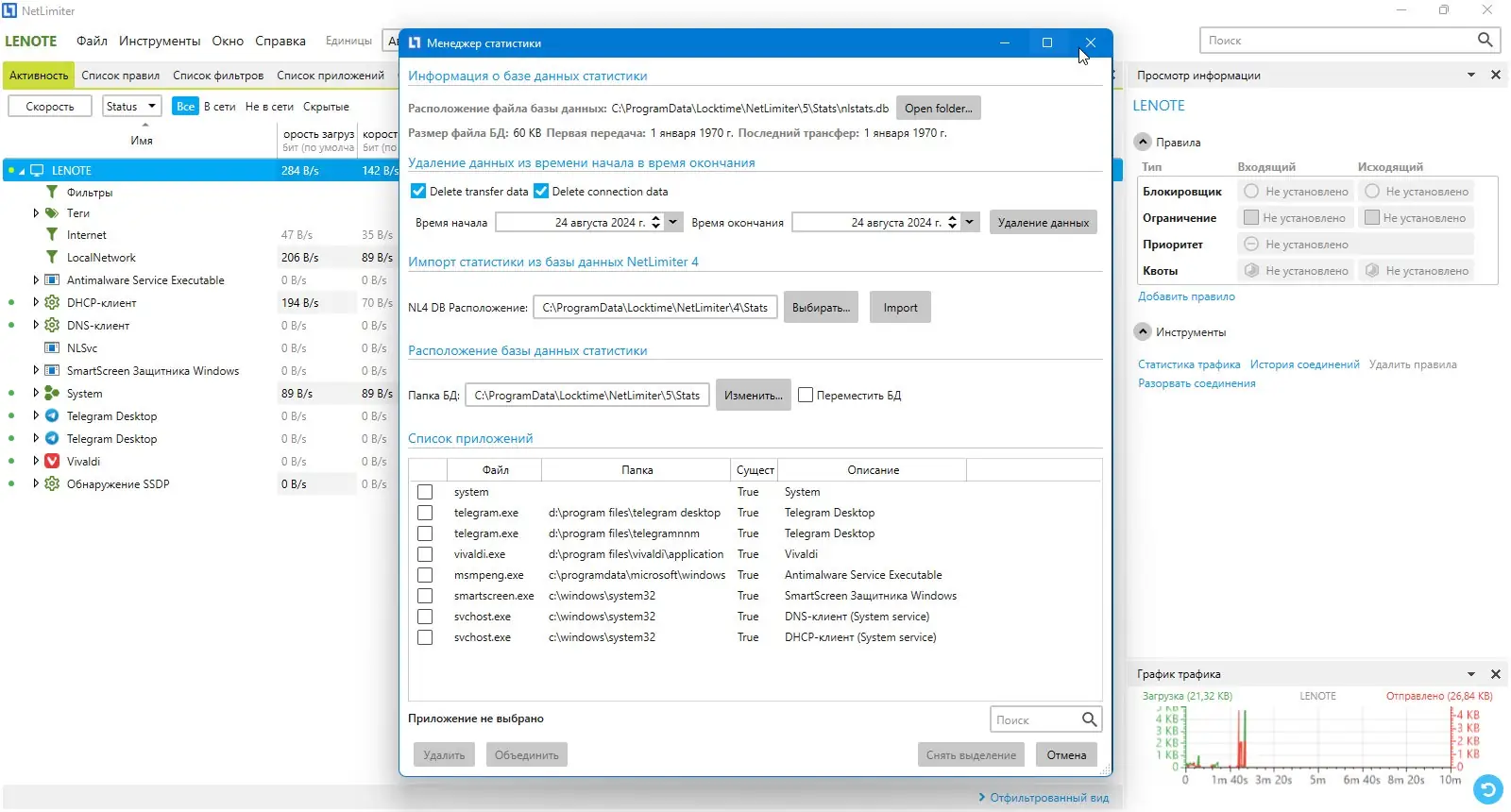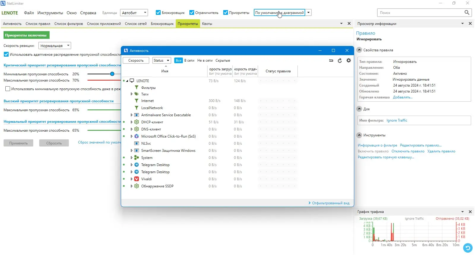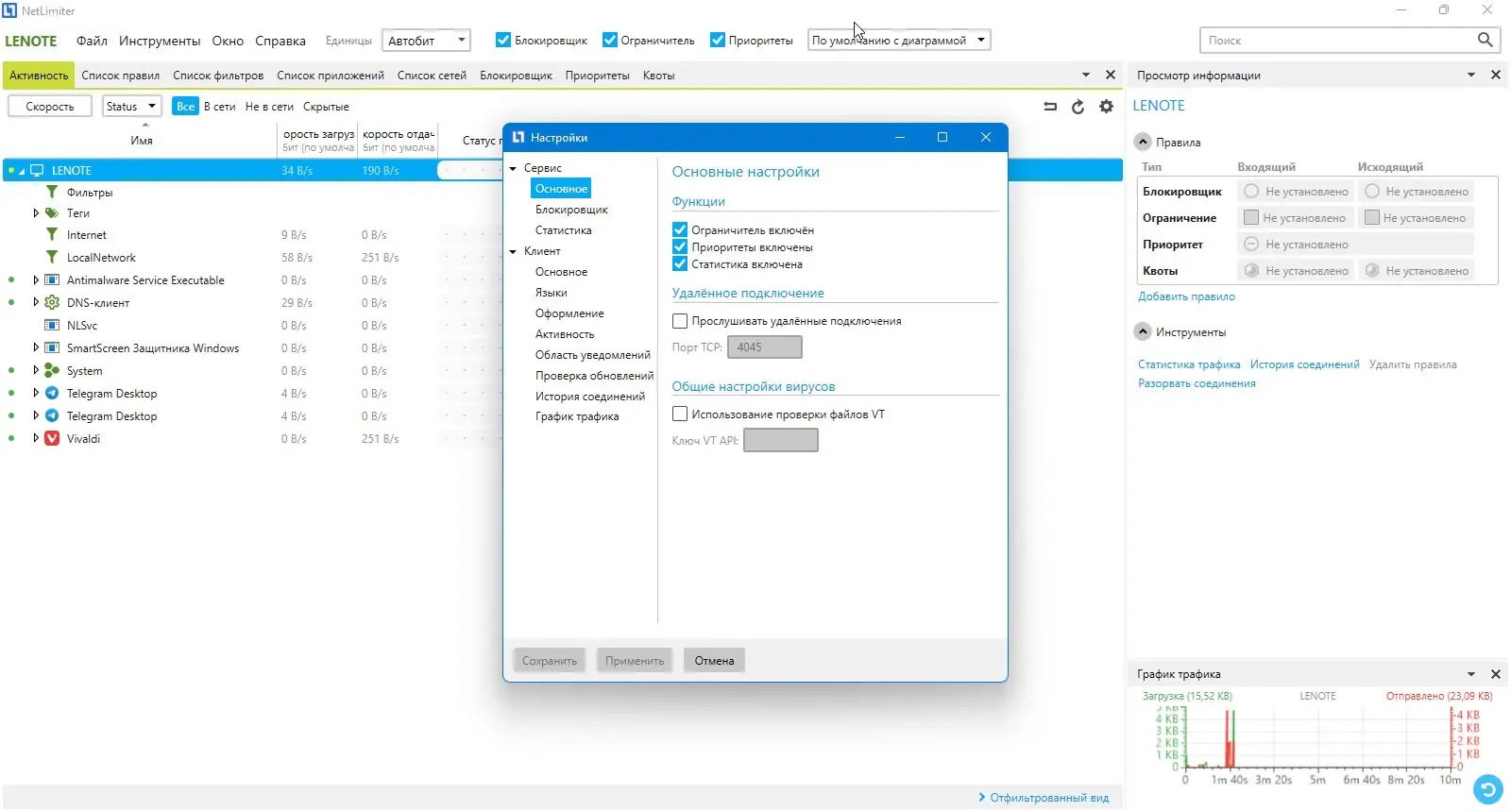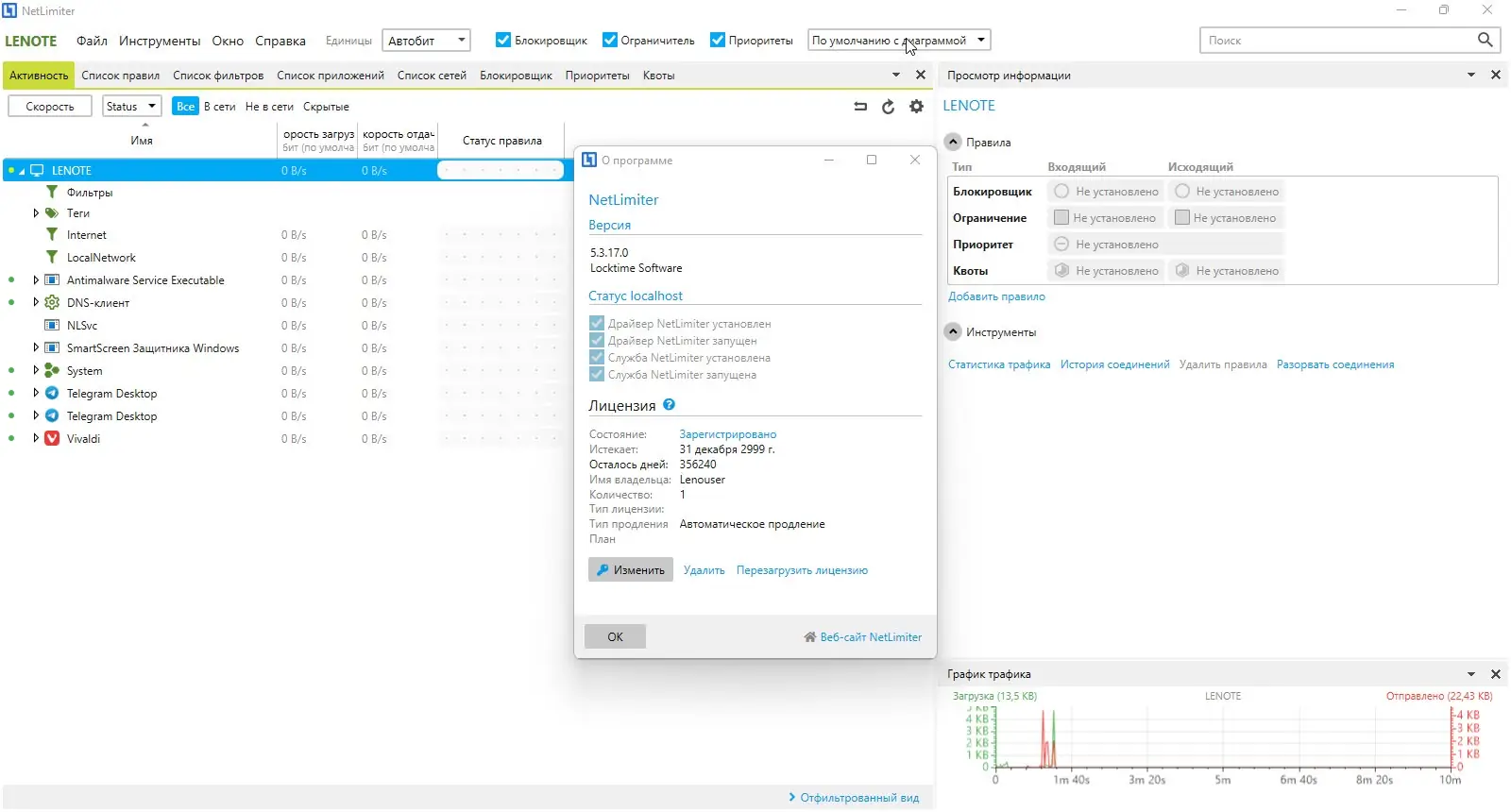 NetLimiter — это мощная программа для контроля и управления сетевым трафиком на компьютере. Она позволяет следить за деятельностью каждого приложения, использующего доступ к Интернету, а также активно управлять пропускной способностью, устанавливая лимиты для загрузки и выгрузки данных. Благодаря этому повысить эффективность использования сетевых ресурсов и обеспечить безопасность соединений становится проще и более удобно.