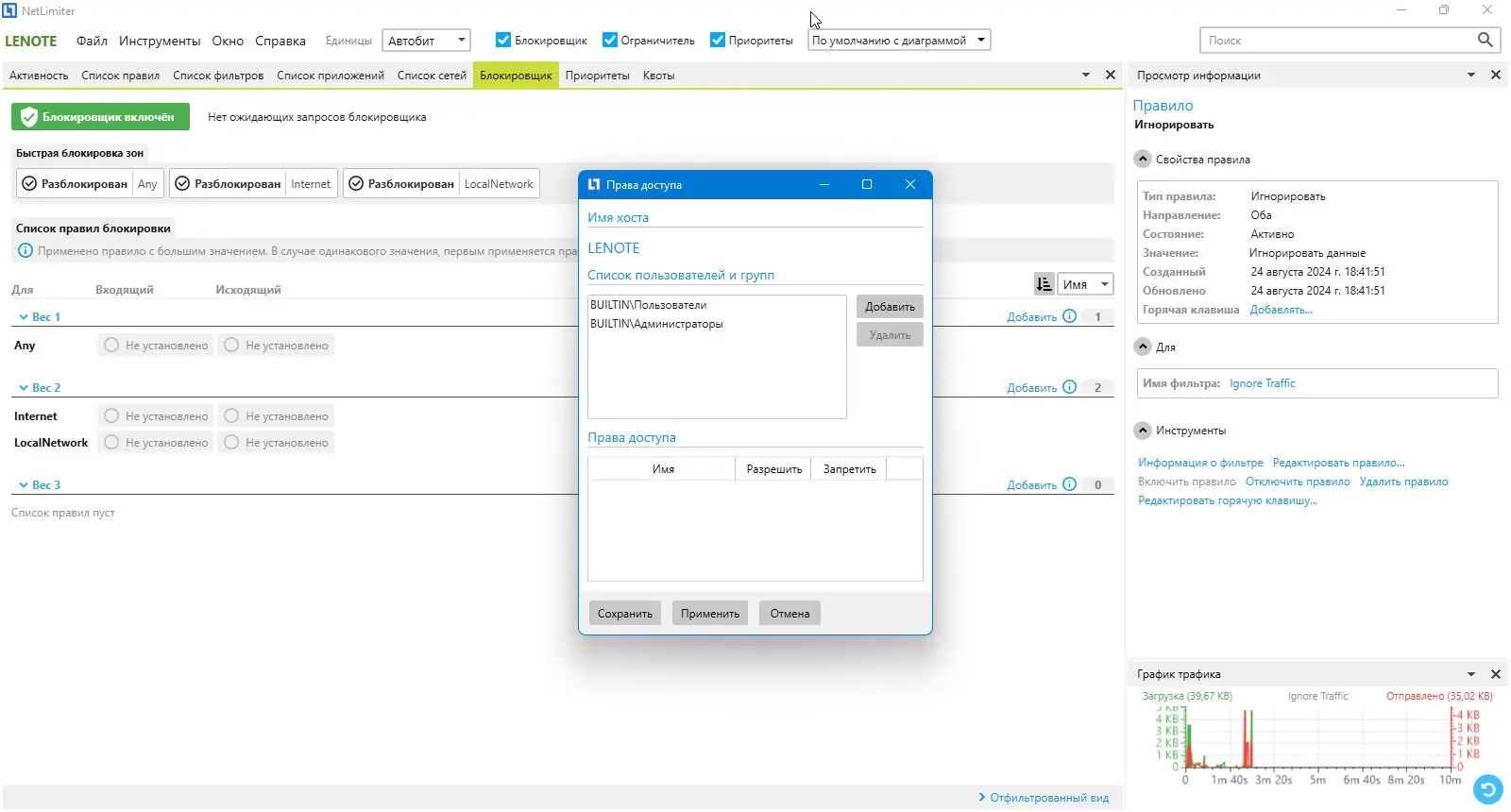 NetLimiter решает проблему контроля сетевого трафика, предоставляя подробную статистику и гибкие инструменты управления данными. Пользователи могут настраивать скорость передачи информации для каждого отдельного приложения или соединения, что позволяет избегать излишней нагрузки на сеть и оптимизировать работу системы. Кроме того, в программе реализованы функции блокировки доступа в Интернет для выбранных приложений, а также приоритезации трафика, что особенно актуально при использовании нескольких приложений одновременно. Мониторинг в реальном времени и поддержка различных фильтров делают управление сетью точным и информативным. Также предусмотрена возможность планирования задач и удаленного администрирования для более удобного использования в корпоративной среде.