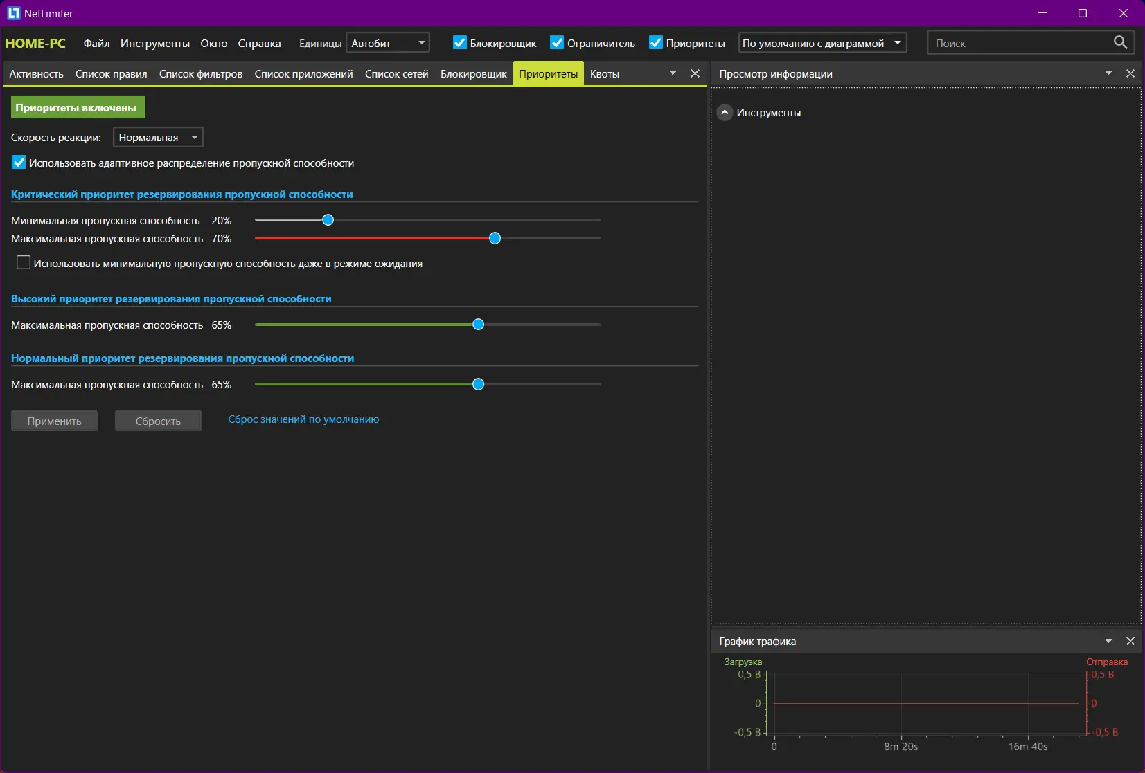 - Ограничение скорости загрузки и отправки данных.