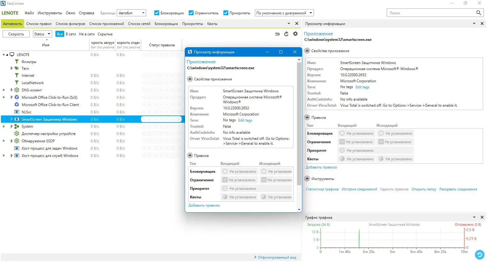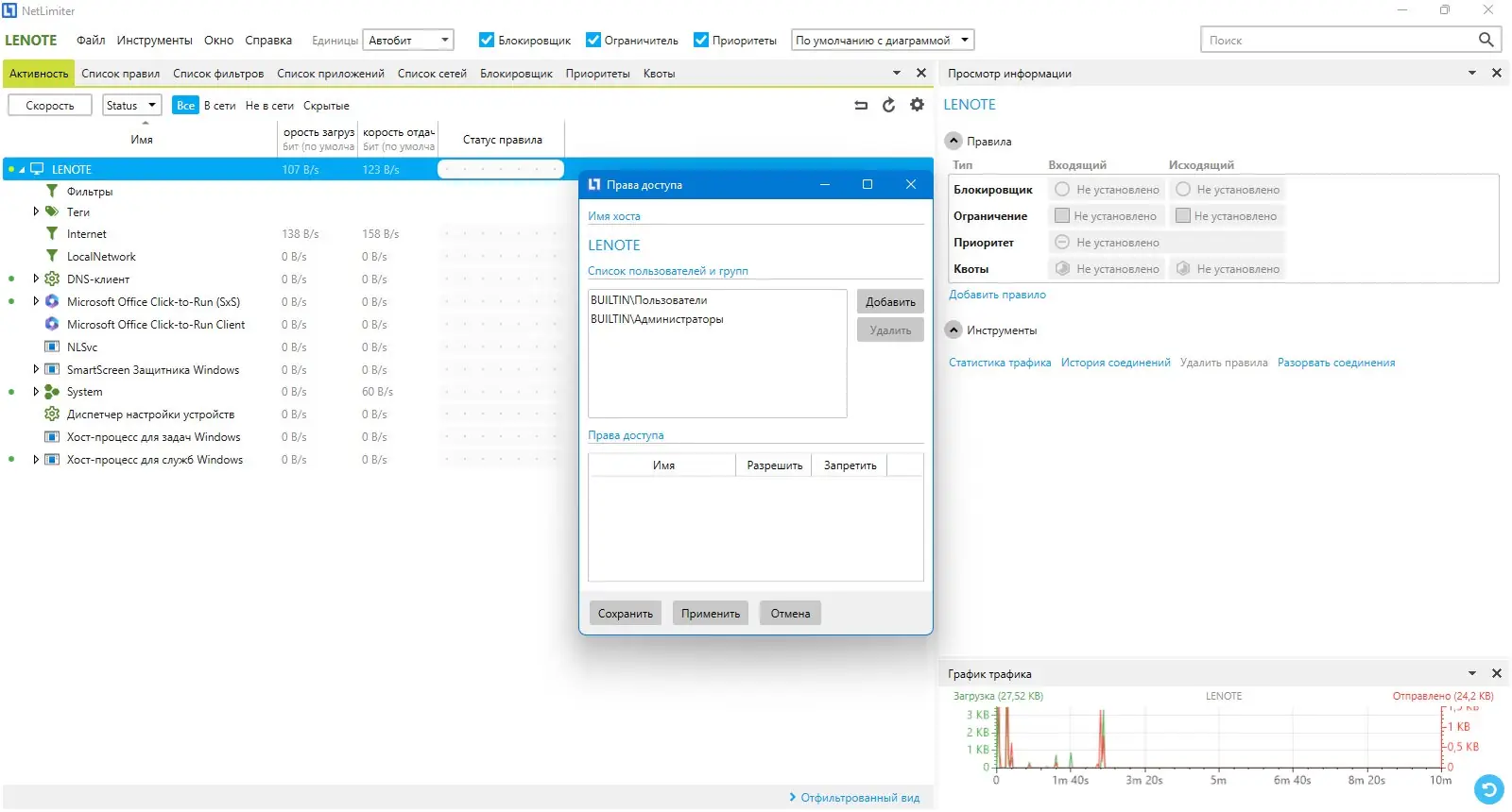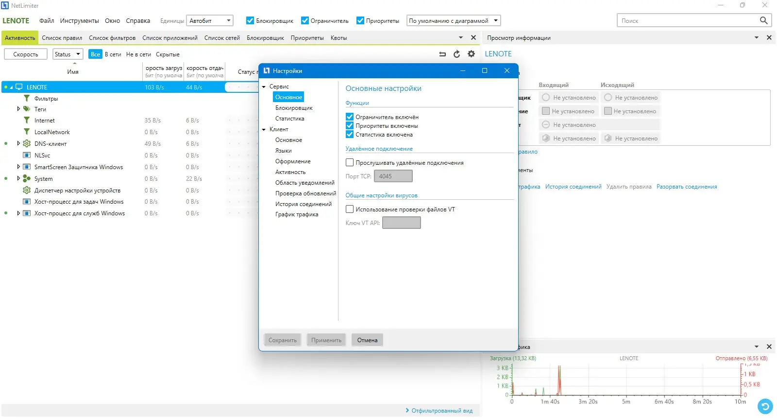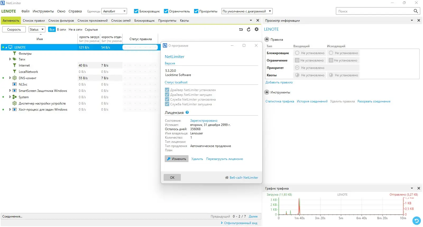 NetLimiter — это мощное решение для контроля сетевого трафика, позволяющее следить за деятельностью каждого приложения, получающего доступ к Интернету. Программа активно управляет скоростью передачи данных, дает возможность настроить лимиты и приоритеты для отдельных соединений и приложений, а также ведет подробную статистику использования сети в виде графиков и таблиц.