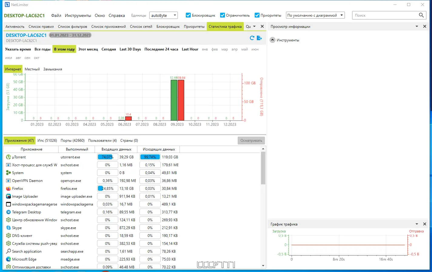 Это решение решает проблему контроля сетевого трафика, активно следит за деятельностью приложений, использующих доступ к Интернету, и предоставляет инструменты для регулировки скорости передачи данных. С помощью NetLimiter можно индивидуально настраивать лимиты для каждого приложения или соединения, что помогает балансировать ресурсы сети и предотвращать чрезмерное их использование. Программа ведет подробную статистику, визуализируя информацию в виде графиков и таблиц, что значительно упрощает управление сетью на ПК.