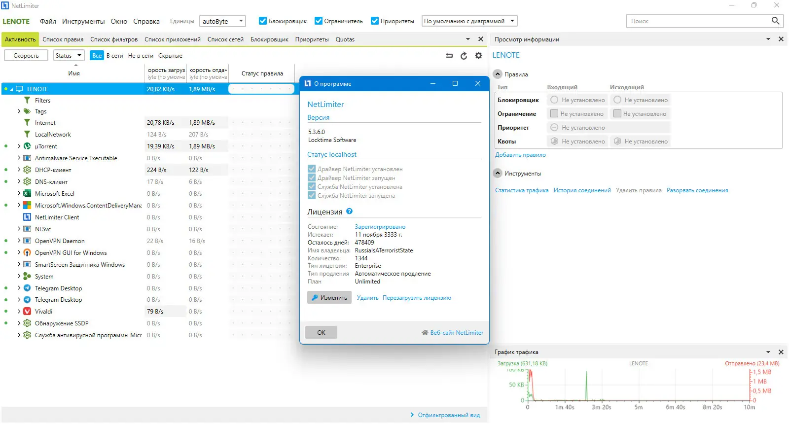 NetLimiter — это мощная программа для контроля и управления сетевым трафиком на вашем компьютере. Она позволяет отслеживать деятельность приложений, использующих доступ к Интернету, а также активно регулировать скорость передачи данных для каждого соединения или приложения.