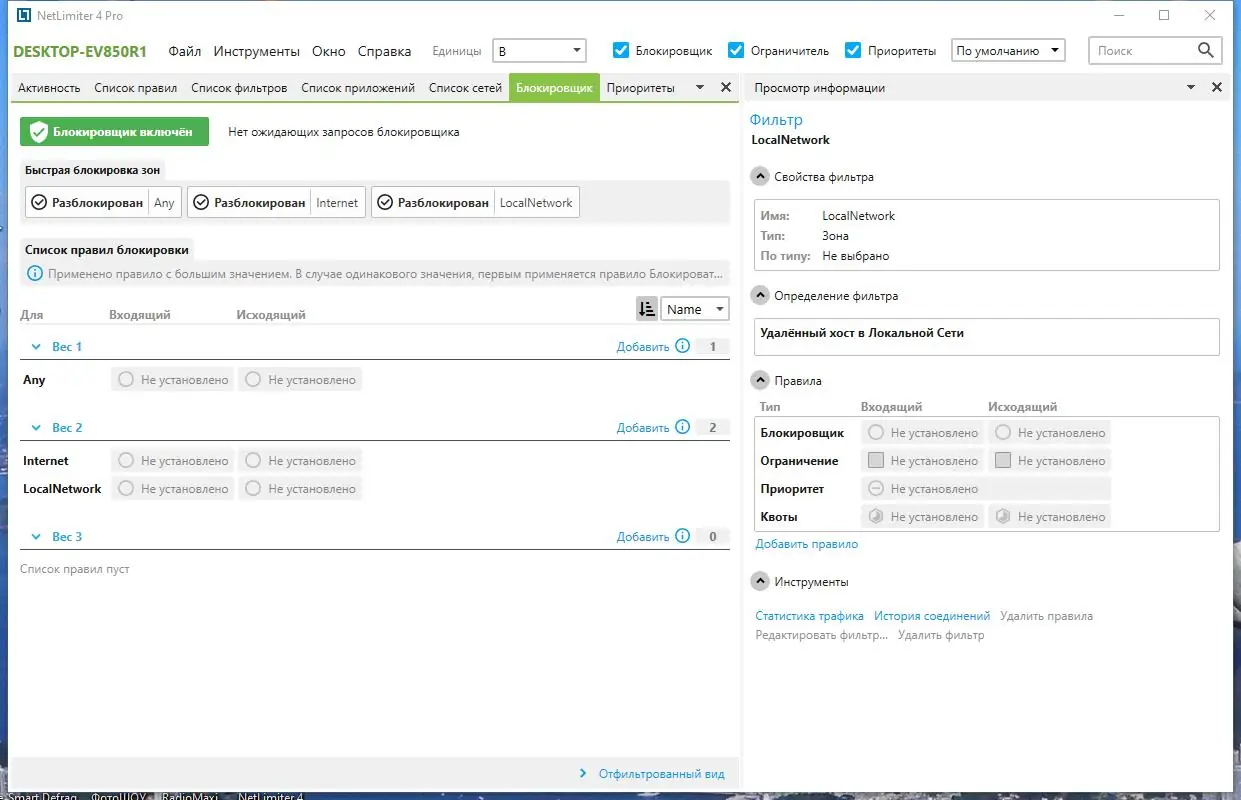 Также NetLimiter предоставляет настройки фильтров по направлениям, протоколам, IP-адресам и приложениям, а планировщик заданий позволяет автоматически включать или отключать ограничения согласно графику. Встроенная функция удаленного администрирования и возможность назначения прав позволяют управлять программой нескольким пользователям, что делает её незаменимым инструментом для системных администраторов и продвинутых пользователей.