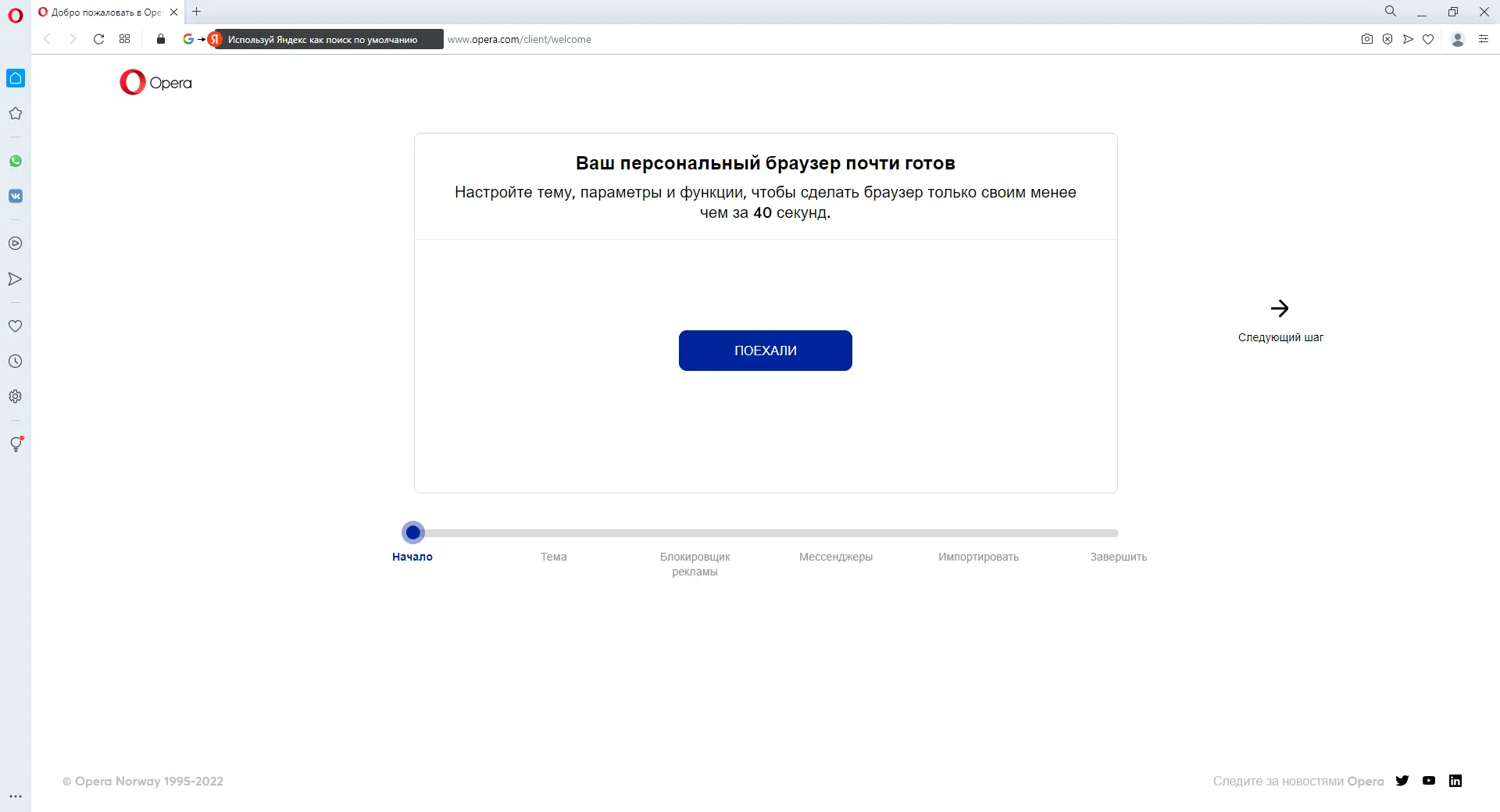 - После завершения установки запустите браузер и произведите первоначальную настройку.