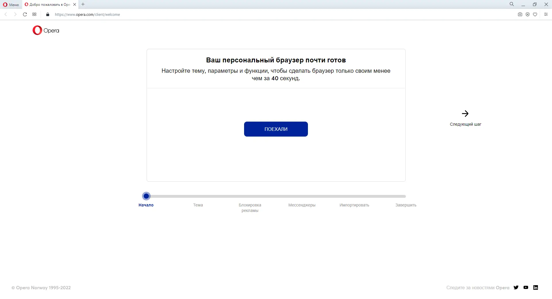 - Завершить установку и запустить браузер для первичной настройки.