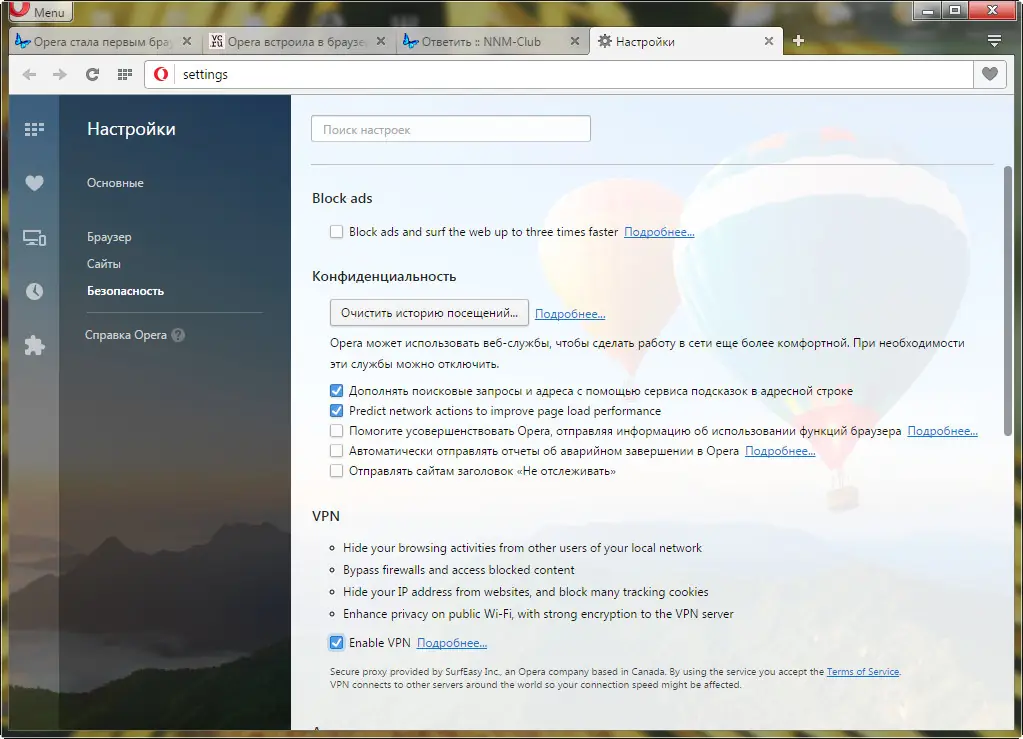 - Встроен бесплатный VPN-сервис для анонимной работы и обхода блокировок