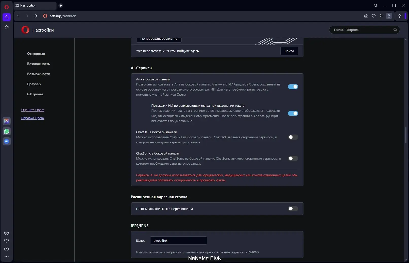 - При необходимости настроить функции VPN и расширения для расширения возможностей браузера.