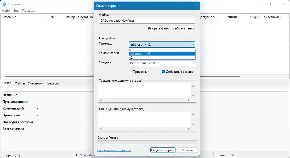 ПикоТorrent — это крошечный и минимальный клиент BitTorrent, разработанный для быстрой и надежной загрузки файлов. Отличается высокой производительностью, низким потреблением памяти и удобным пользовательским интерфейсом. Поддержка надежного шифрования и туннелирования через I2P, SOCKS4, SOCKS5 и HTTP (S) обеспечивает максимальную конфиденциальность и безопасность при использовании. Работает как с IPv4, так и с IPv6, что делает его универсальным инструментом для различных сетевых условий. Ваша загрузка остается быстро и безопасно.