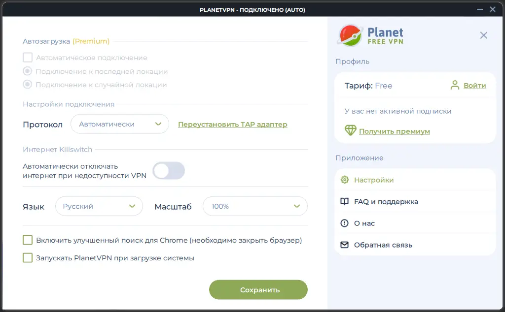 PlanetVPN — это универсальное VPN решение, которое сочетает простоту использования и высокий уровень защиты. В отличие от многих аналогов, данный сервис не ведет логи и использует надежное шифрование для обеспечения безопасности ваших данных. Поддержка протоколов OpenVPN и IKEv2, технология Kill Switch и защита от DNS- и IP-утечек делают соединение максимально защищенным и стабильным. Помимо этого, PlanetVPN предлагает одновременную работу до 10 устройств, что позволяет обеспечить защиту всей семьи или парка устройств.