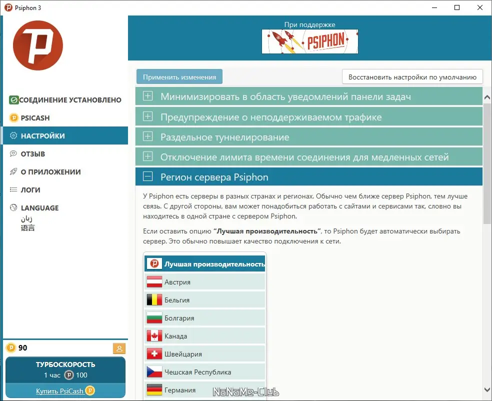 - Запустить приложение и выбрать нужный сервер или воспользоваться автоматическим подключением.