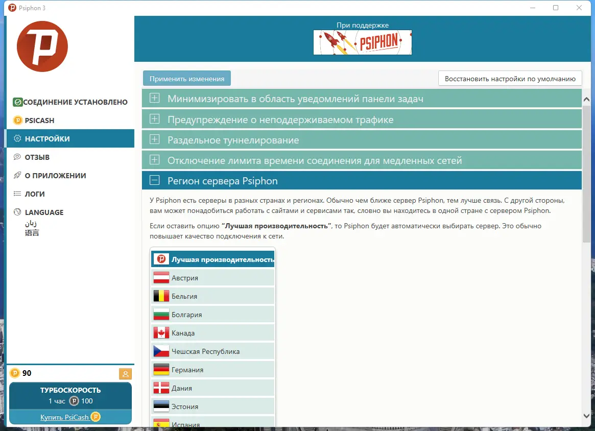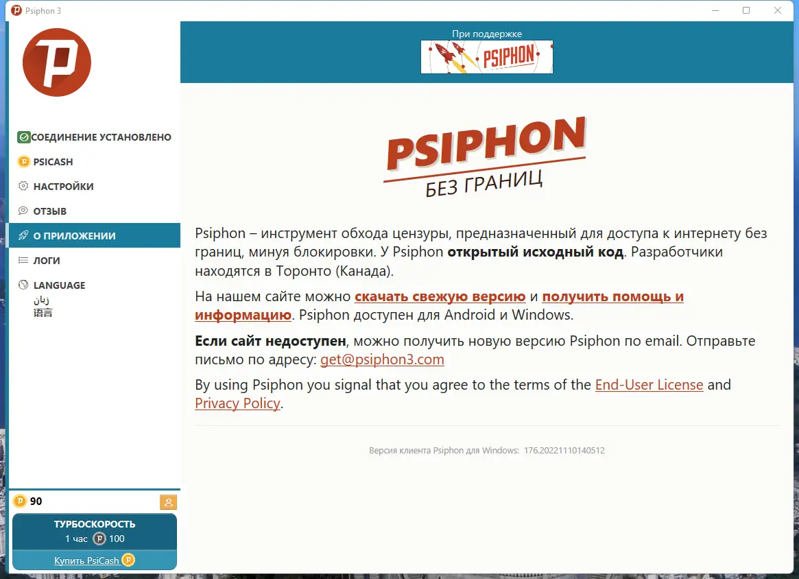 Обратите внимание, что портативную версию рекомендуется хранить в папке «%APPDATA%\Psiphon3», чтобы сохранять настройки при переносе между системами.