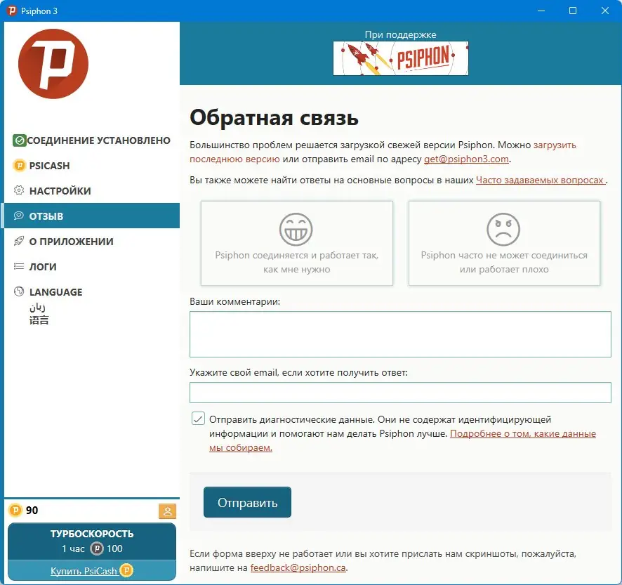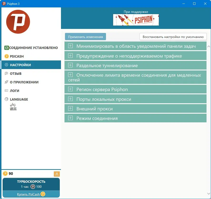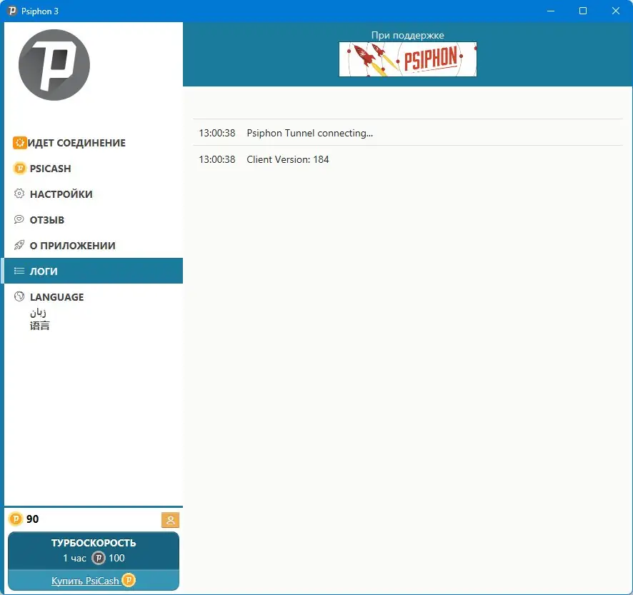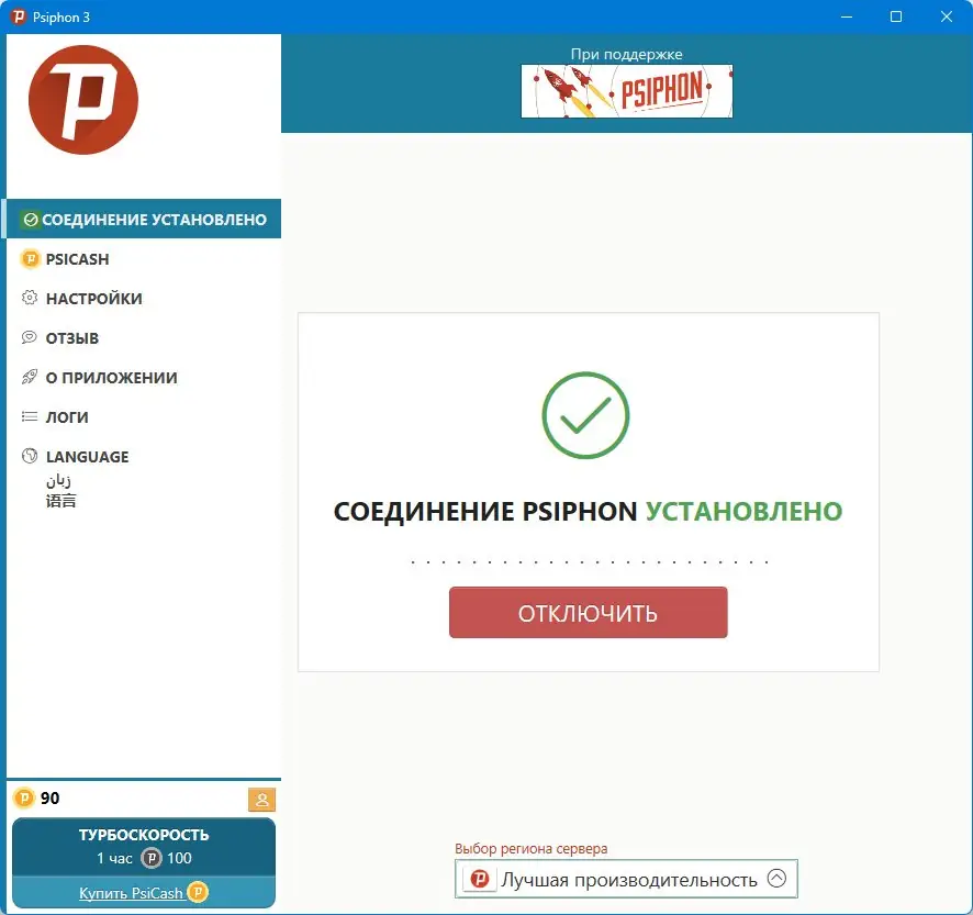 - Запустить файл Psiphon.exe, после чего программа автоматически подключится к серверу.