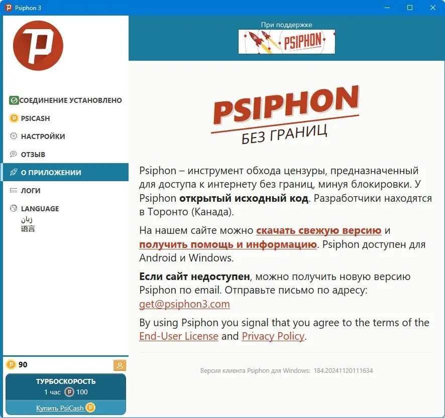 Psiphon — это современный инструмент обхода интернет-цензуры, разработанный компанией Psiphon Inc. Он использует технологии VPN, SSH и HTTP прокси, что позволяет автоматически обновлять список серверов и повышать шансы на успешный обход блокировок. Программа предназначена для предоставления открытого доступа к онлайн-ресурсам, при этом не гарантируя повышенной конфиденциальности или безопасности пользователя. Настоящая версия подходит для пользователей с ОС Windows 7, 8/8.1, 10 и 11, а также поддерживает архитектуру x32 и x64 Bit.