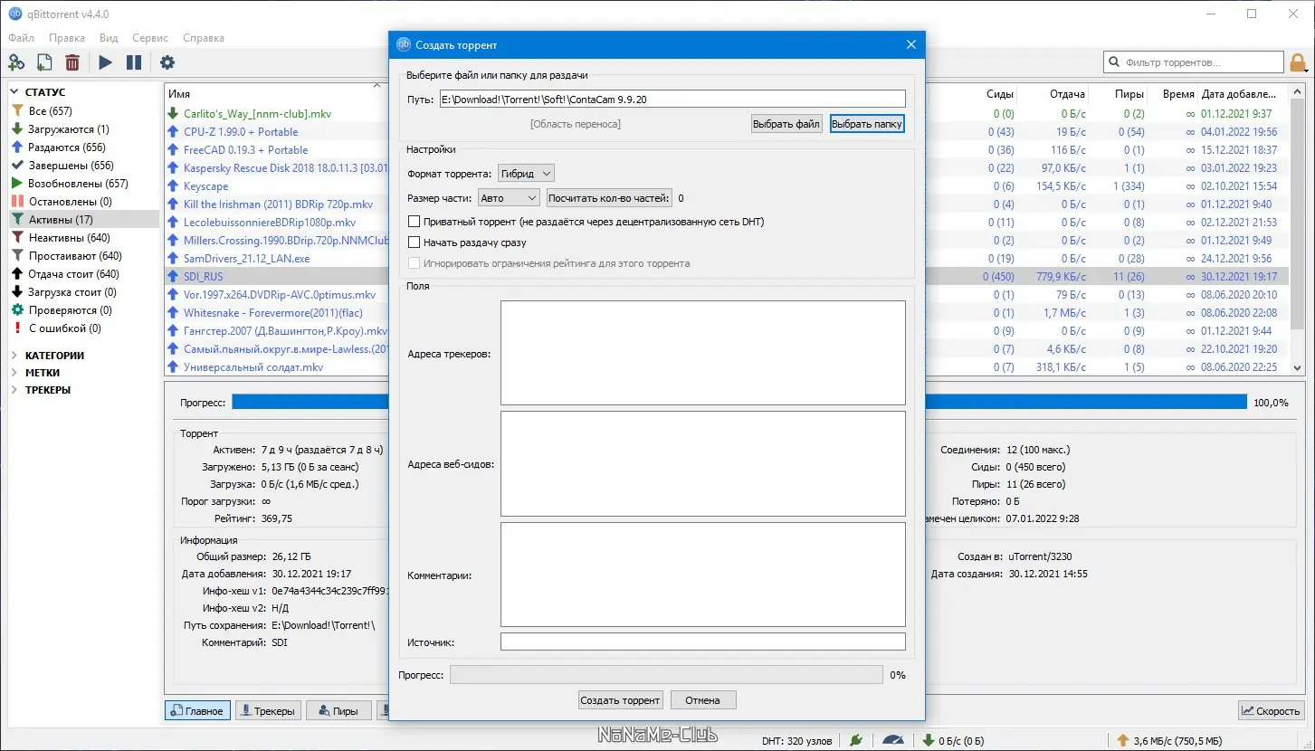 - Создание собственных торрентов и публикация через меню «Инструменты»