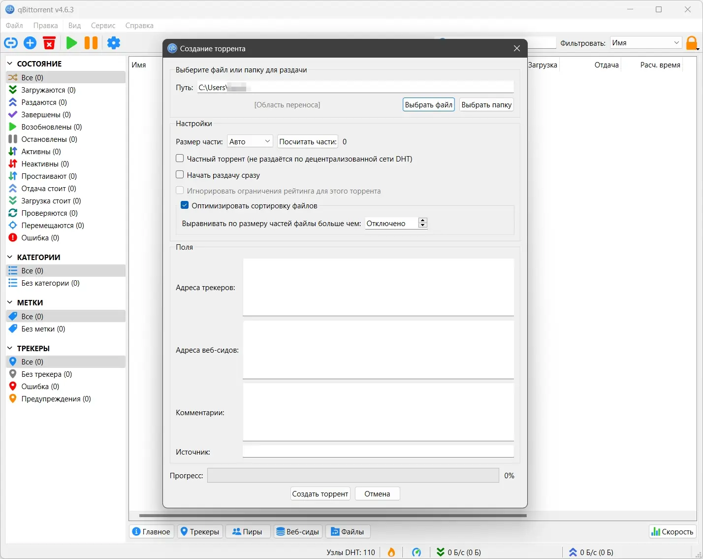 - Поддержка меток и создание торрентов через меню «Инструменты»