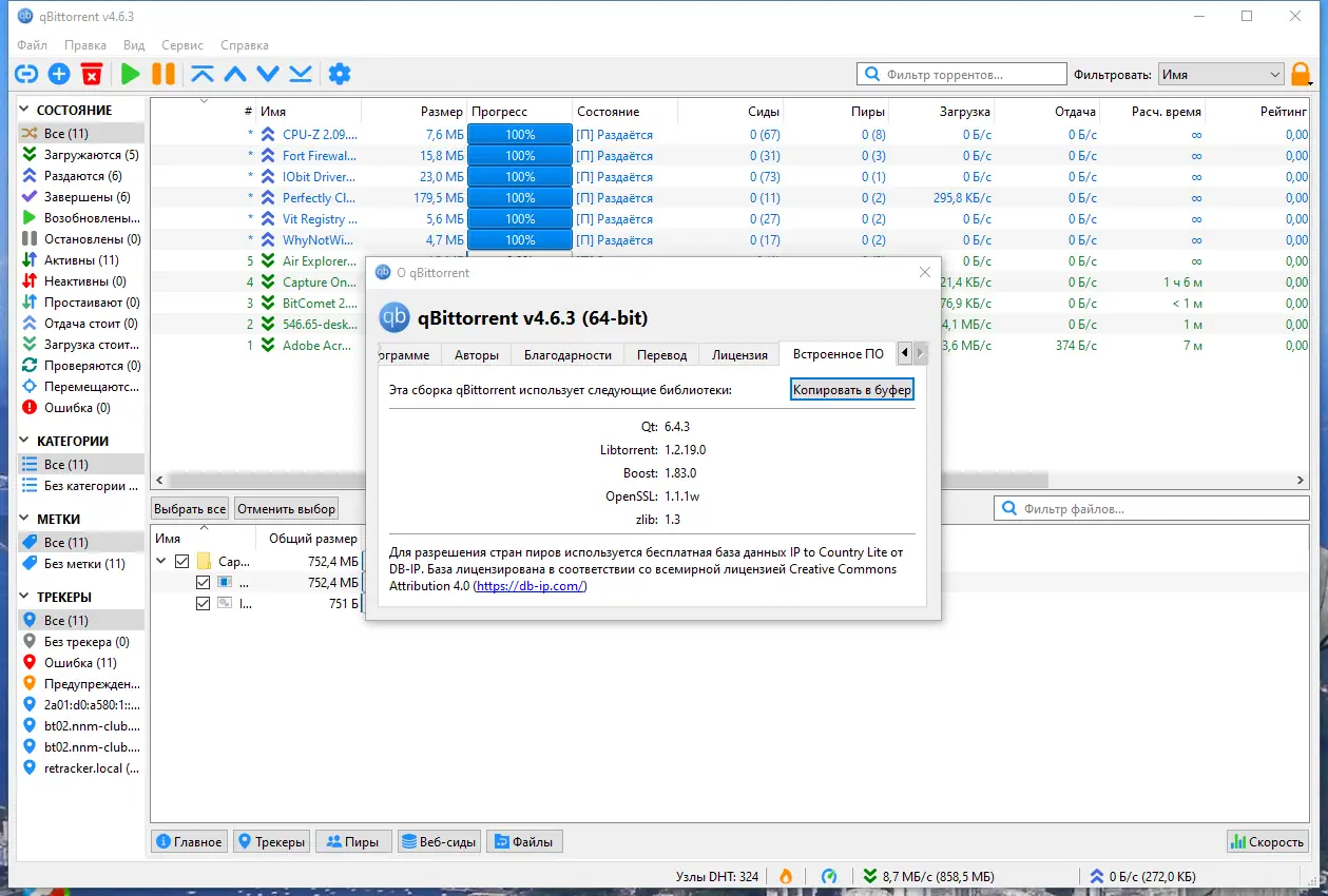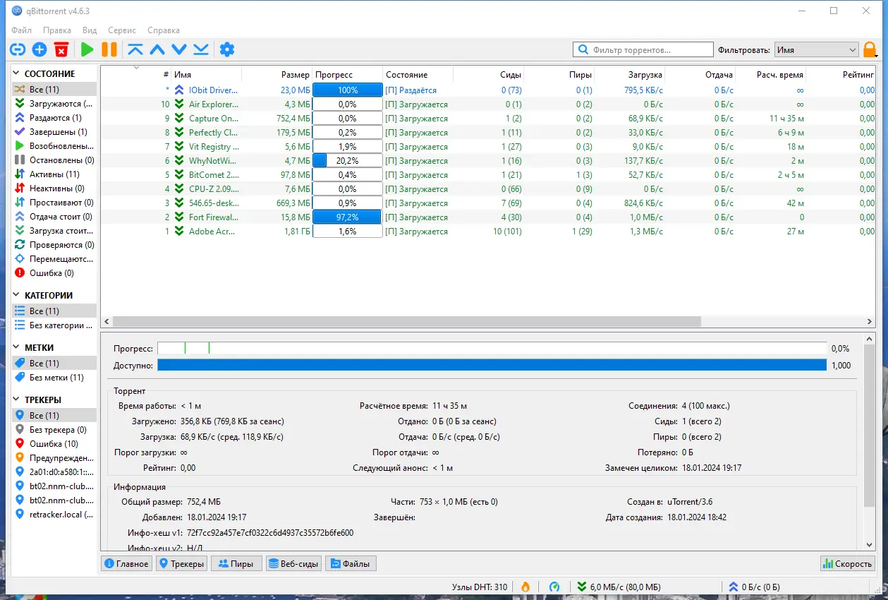 - Расширенные настройки контроль над трекерами, пирами, приоритетами внутри торрентов и выбора содержимого.