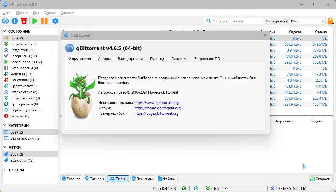 Эта программа написана на языке C++ и основана на библиотеке libtorrent-rasterbar. Интерфейс реализован с использованием Qt, что обеспечивает интуитивное управление и привлекательный внешний вид. Несмотря на свою простоту, qBittorrent обладает множеством полезных функций, позволяющих тщательно настраивать процесс скачивания. Среди ключевых особенностей — встроенная поисковая система, расширяемая с помощью плагинов, поддержка UPnP/NAT-PMP, встроенный менеджер ограничения скорости и возможность удаленного управления через веб-интерфейс. Программа отлично подходит для пользователей, работающих на платформах Windows 7, 8/8.1, 10 и 11, а также на Linux, OS X и других операционных системах.