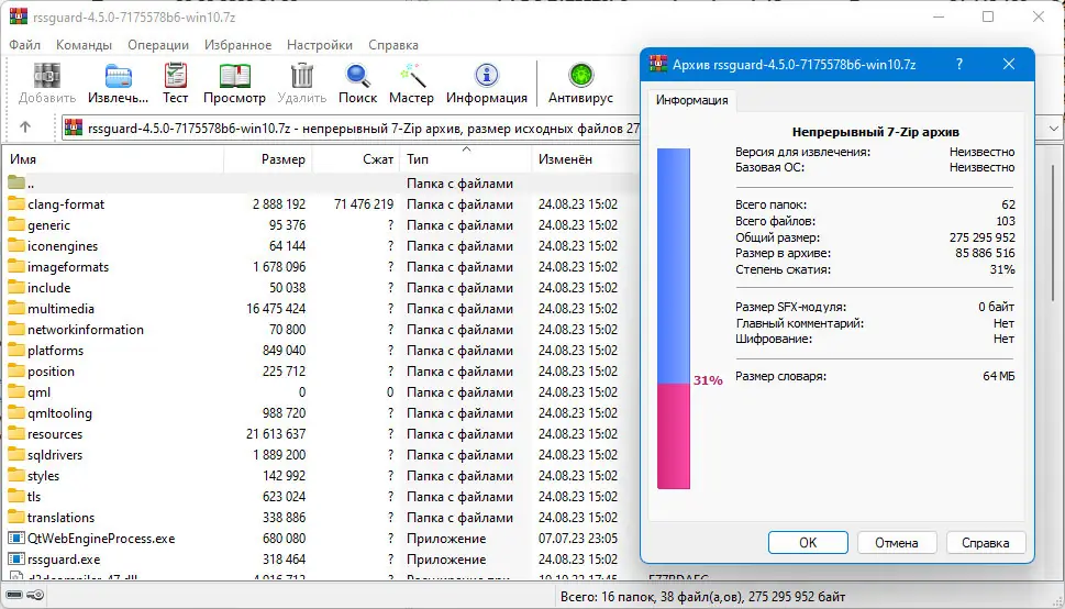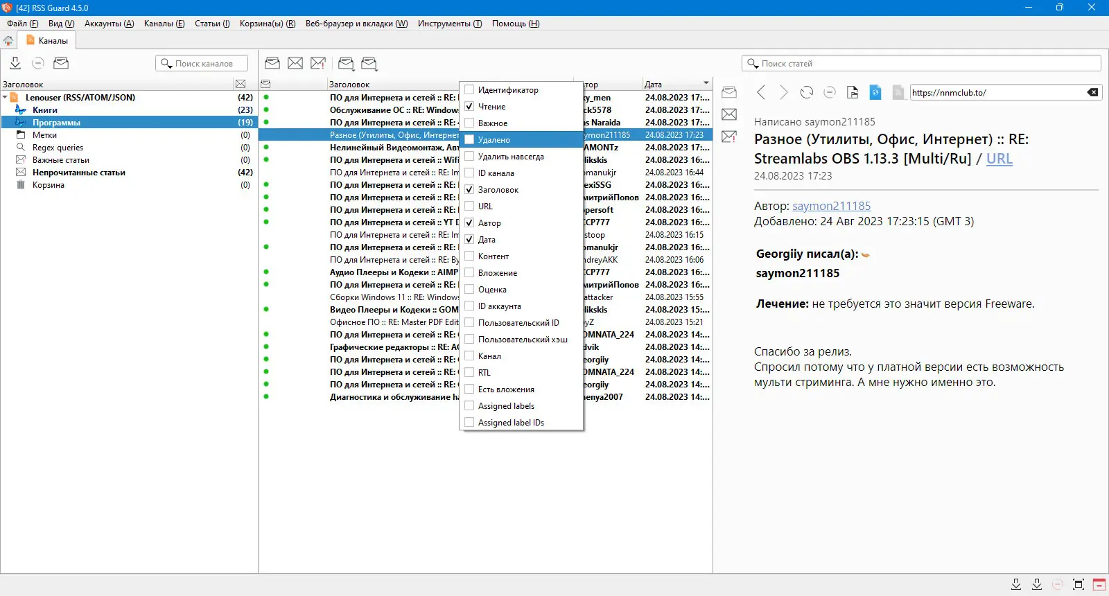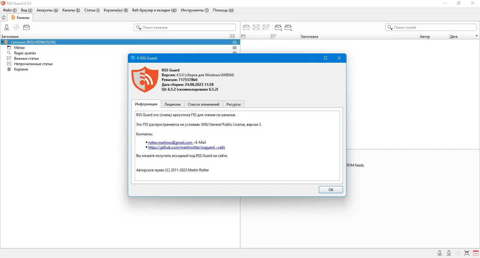 RSS Guard — это простое, удобное и функциональное графическое приложение на базе C++ и QT для чтения и управления новостными лентами (RSS-каналами). Предназначено для эффективного мониторинга обновлений в любимых источниках информации, обеспечивает лаконичный интерфейс с возможностью кастомизации темы оформления. Поддерживаются все популярные форматы лент, такие как RSS, Atom, PDF и другие. Для хранения пользовательских данных используется надежная реляционная СУБД MySQL. Варианты распространения включают полную и облегченную версии без собственного WEB-движка. Совместимость с Windows 7, а также Windows 8/8.1, 10 и 11. Для Windows 7 применяются версии с QT-5, для Windows 10 и 11 — с QT-6. Программа распространяется бесплатно, что делает её доступной каждому пользователю.