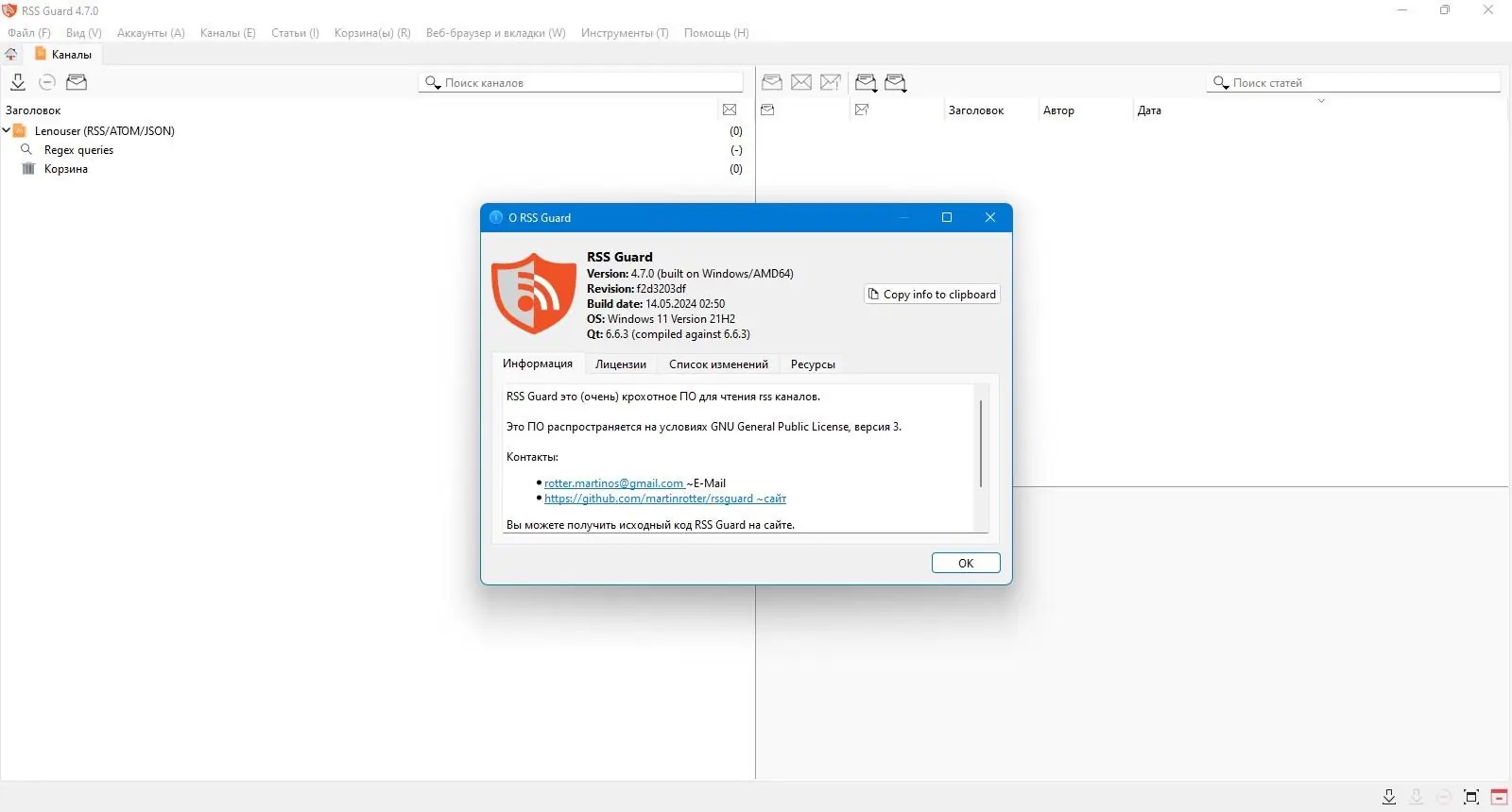 RSS Guard — это простое, бесплатное графическое приложение, разработанное на C++/QT для удобного чтения новостных лент и RSS-каналов. Программа предоставляет лаконичный интерфейс с возможностью изменения темы оформления и поддерживает все основные форматы новостных лент, такие как RSS, Atom, PDF и др. Для хранения данных используется MySQL — свободная реляционная система управления базами данных. Предлагается две версии: полная и облегчённая, без собственного WEB движка. Строгая поддержка Windows 7, Windows 8/8.1, Windows 10, 11 на платформах x32/x64 Bit, работающая под управлением QT-5 и QT-6 в зависимости от версии.