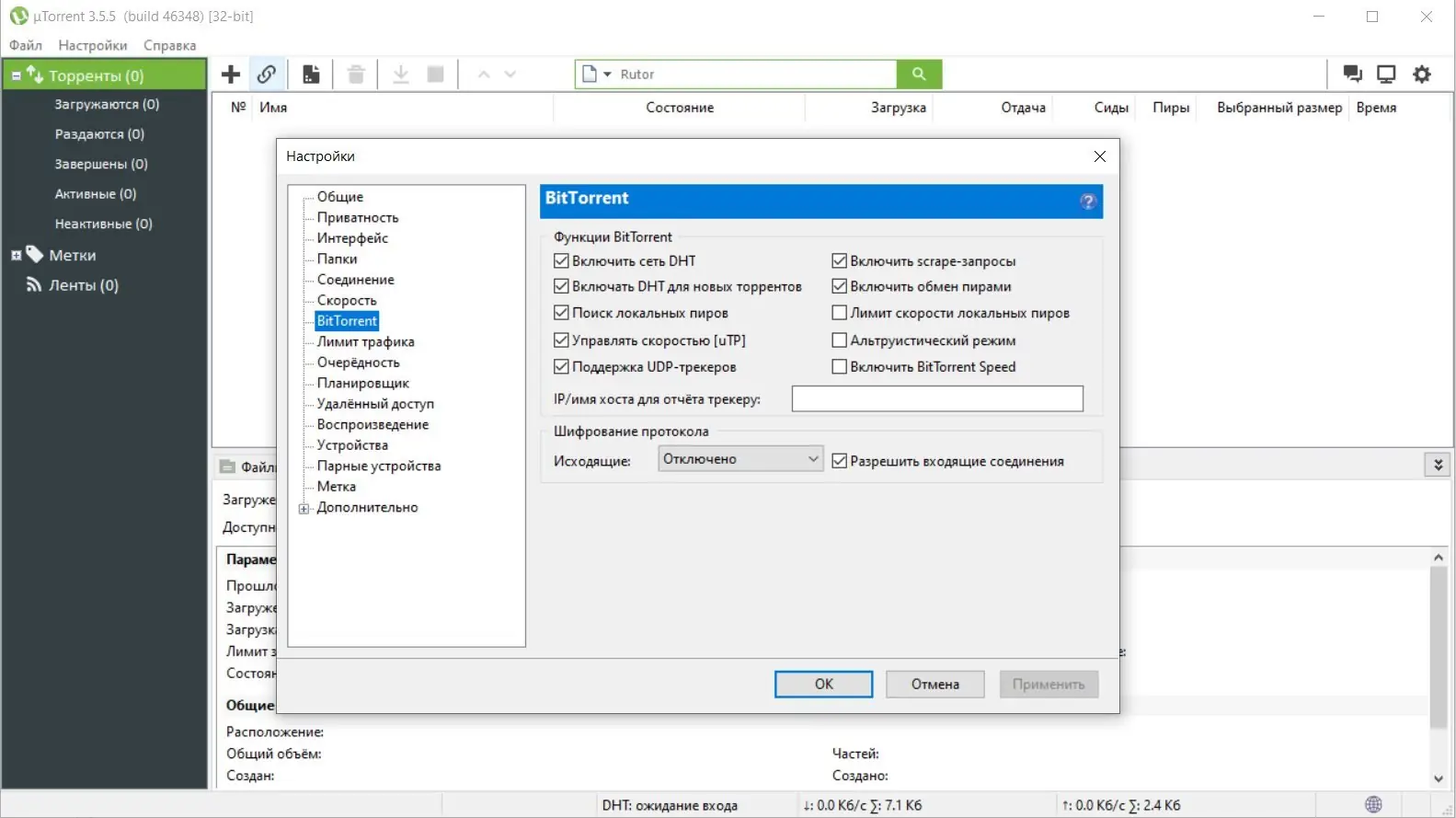 - Поддержка протоколов UPnP, NAT-PMP и шифрования соединений.