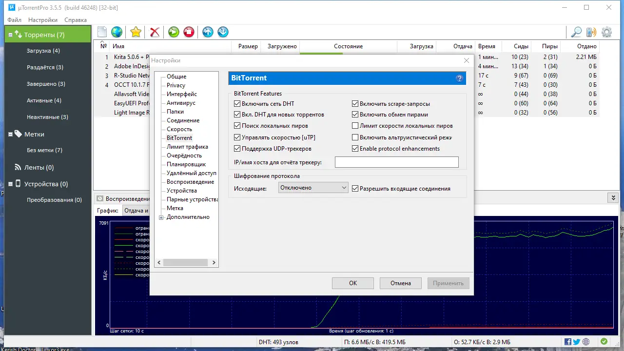 - Шифрование протокола и взаимодействие с другими клиентами по протоколу DHT