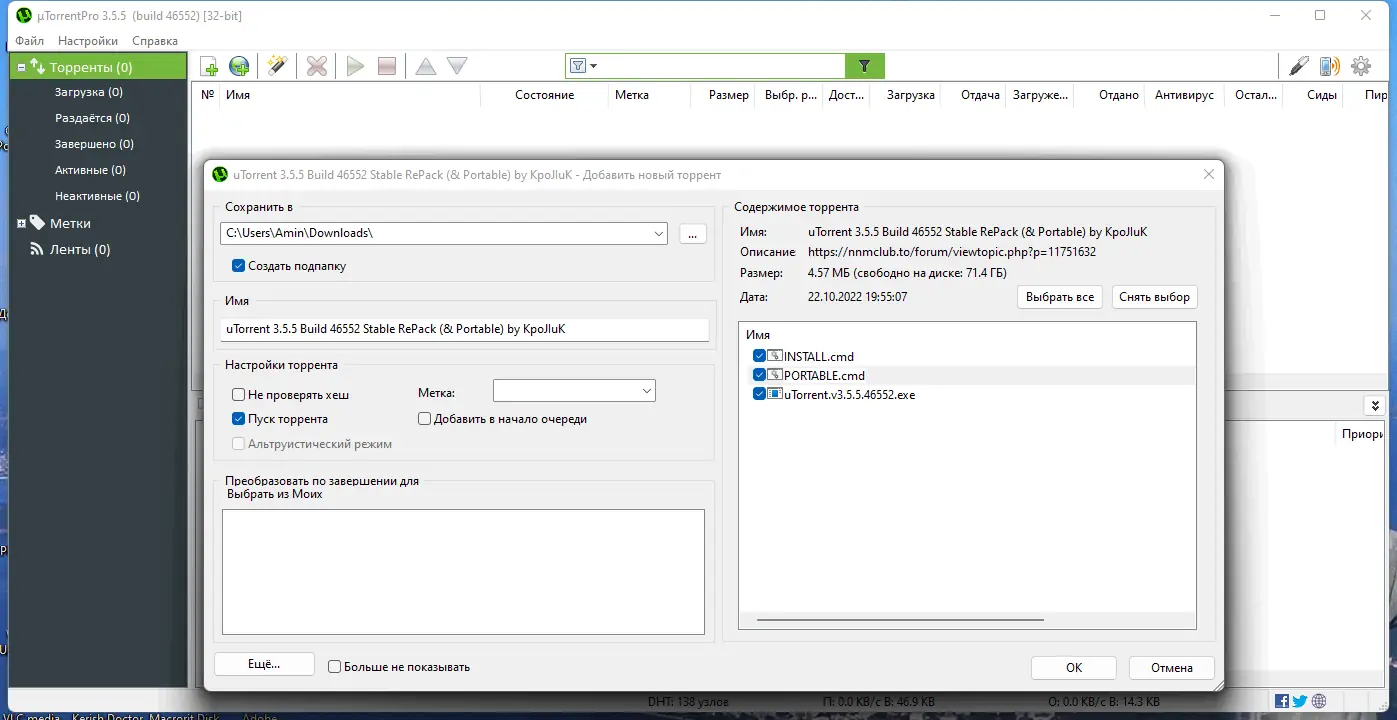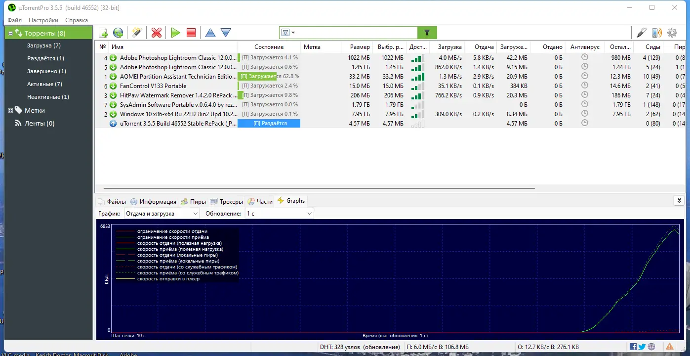 uTorrent — это бесплатный, компактный и достаточно мощный торрент-клиент, предназначенный для работы с сетью BitTorrent. Он занимает мало места на диске, одновременно предлагая широкий функциональный набор. Поддержка работы независимо от трекеров, возможность загружать несколько файлов одновременно, настройка полосы пропускания и восстановления прерванных загрузок делают его незаменимым инструментом для пользователей Windows 7, 8/8.1, 10, 11 на x32 и x64 Bit системах. Кроме того, есть возможность использования в Linux с помощью Wine. Программа отличается низким потреблением оперативной памяти и удобным интерфейсом с поддержкой смены тем и множества языков.