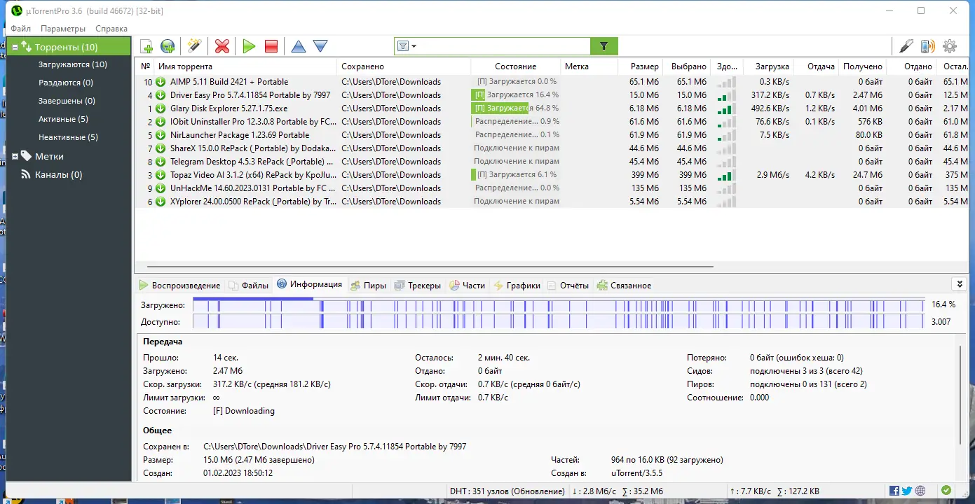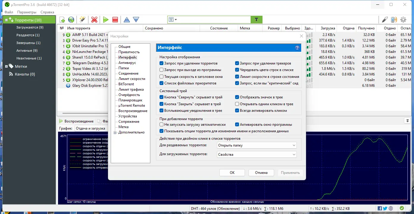 - Взаимодействие с другими клиентами без основного трекера (DHT), шифрование протокола и расширенные настройки сети;