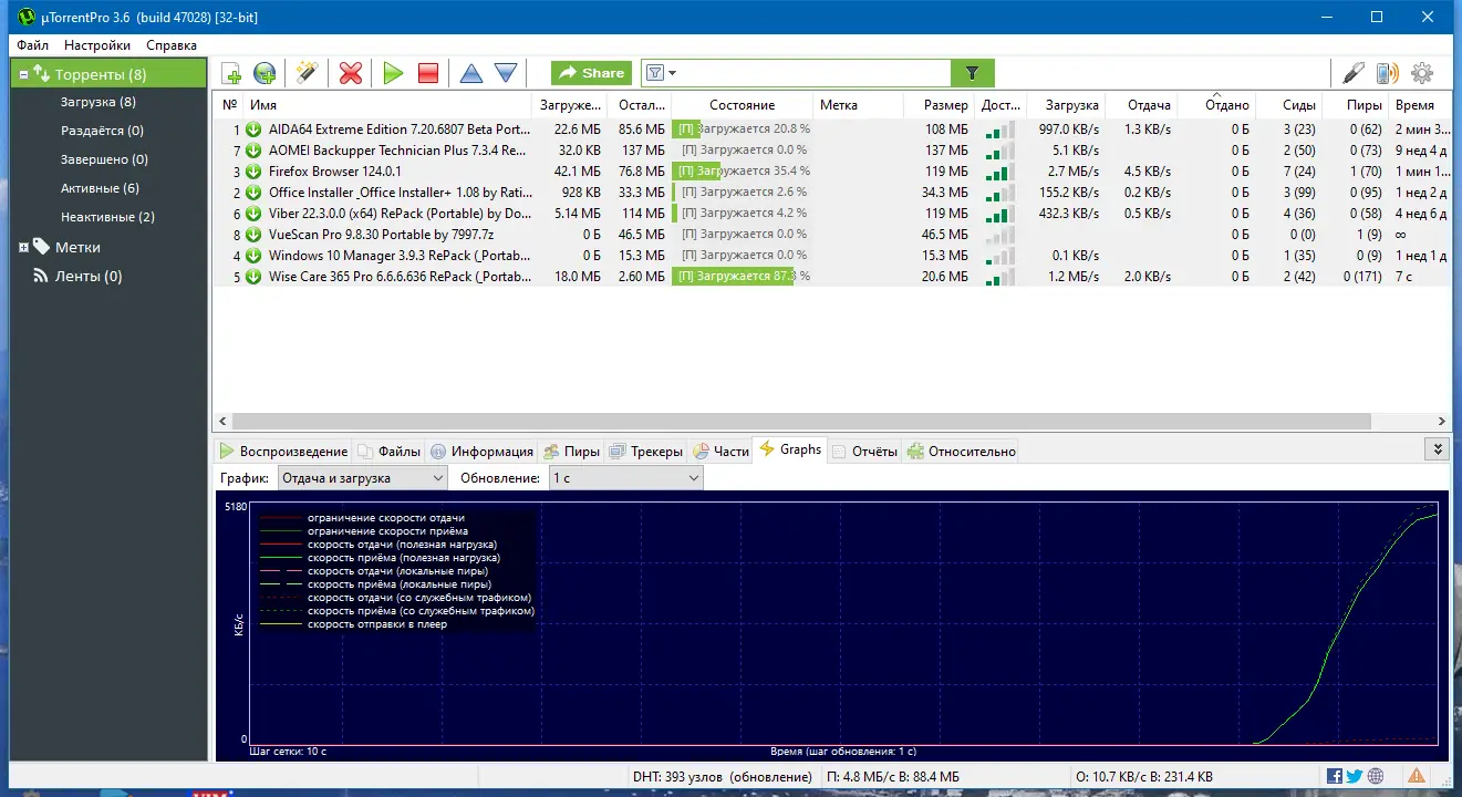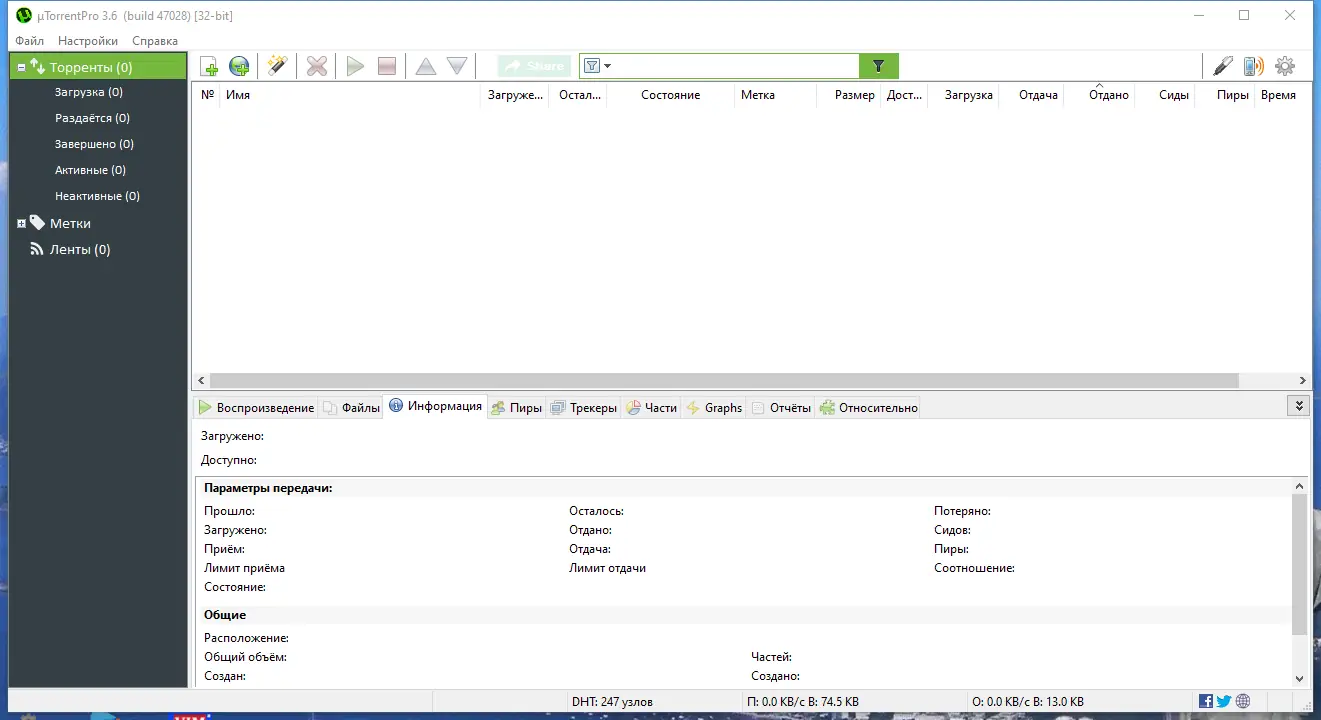 uTorrent — компактный и функциональный торрент-клиент, который сочетает в себе богатый набор возможностей с минимальным размером. Он поддерживает работу независимо от трекеров, что обеспечивает стабильное скачивание файлов даже при отсутствии центральных серверов. Благодаря встроенной оптимизации и настраиваемой полосе пропускания, программа позволяет управлять загрузками эффективно и быстро. Быстрая остановка и возобновление загрузок, восстановление прерванных файлов, поддержка DHT и шифрование протокола — все это делает uTorrent одним из лидеров среди решений для работы с сетью BitTorrent.