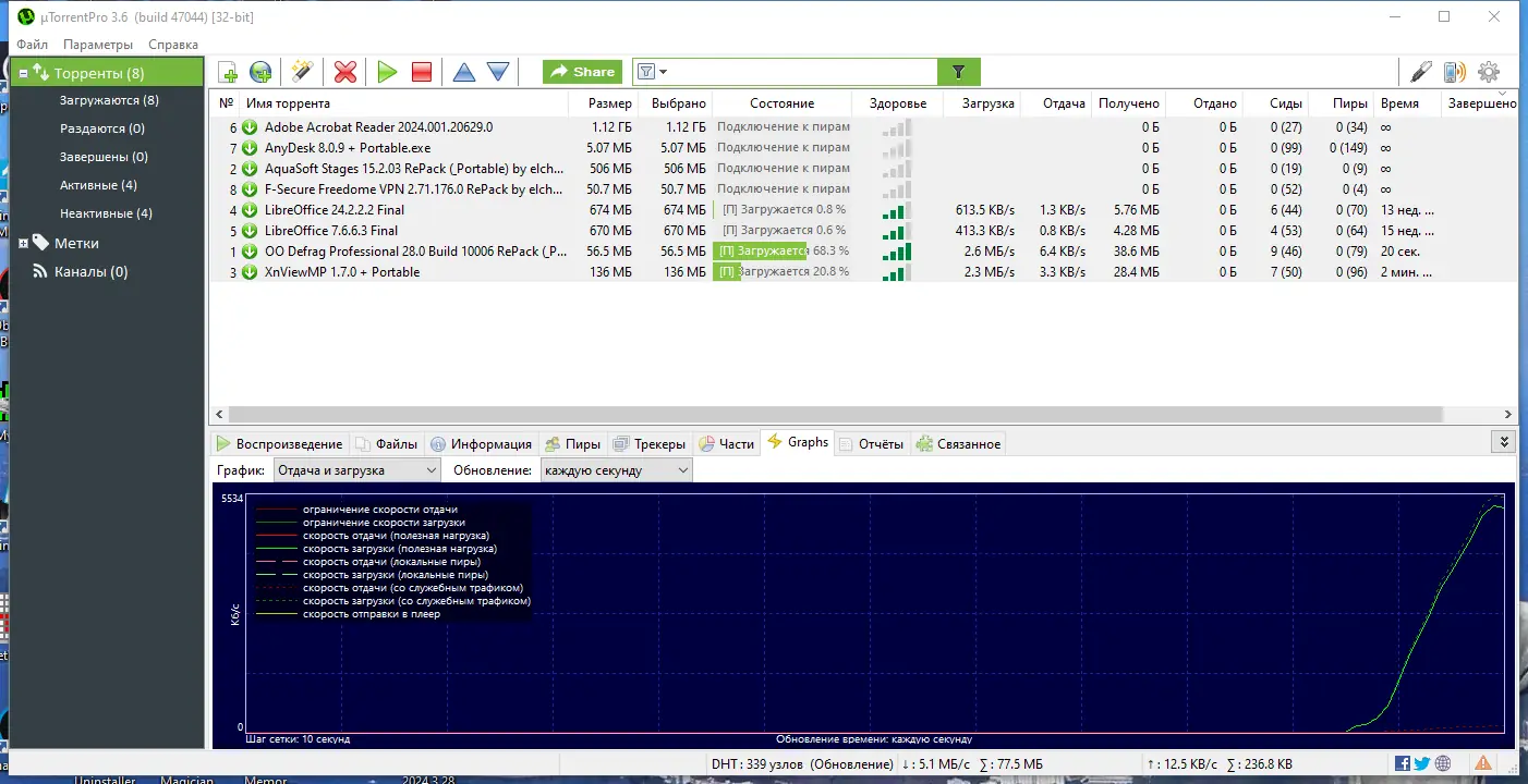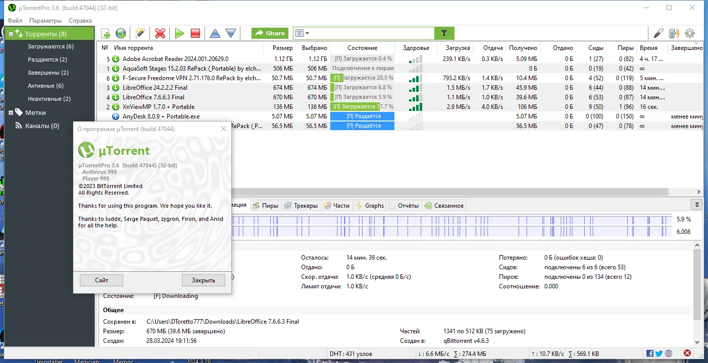 uTorrent — это быстрый и функциональный клиент для работы с торрентами, поддерживающий работу независимо от трекера. Программа обладает небольшим размером, при этом обеспечивает широкий набор возможностей: параллельные загрузки, управление полосой пропускания, автоматическое восстановление прерванных загрузок и много другого. Она подходит для пользователей, которые ценят скорость, эффективность и простоту в использовании при обмене файлами через сеть BitTorrent.